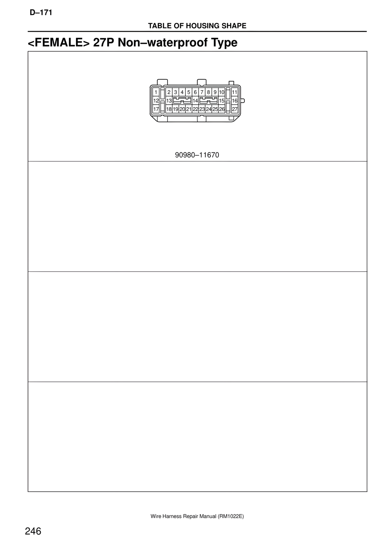 D–171 TABLE OF HOUSING SHAPE <FEMALE> 27P Non–waterproof Type 1 2 3 4 5 6 7 8 9 10 11 12 13 14 15 16 17 18 19 20 21 22 23 24 25 26 27 90980–11670 Wire Harness Repair Manual (RM1022E) 246