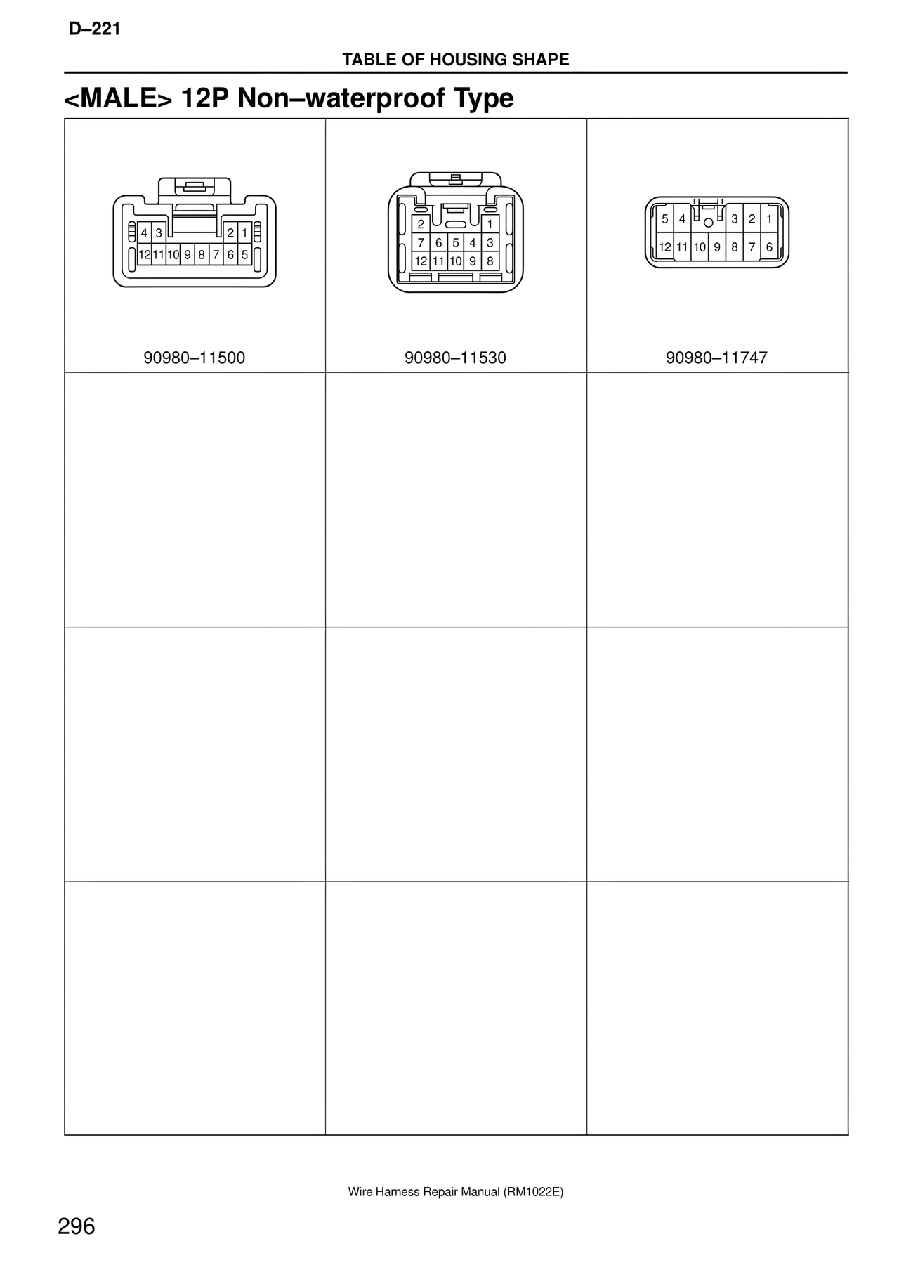 D–221 TABLE OF HOUSING SHAPE <MALE> 12P Non–waterproof Type 4 3 2 1 12 11 10 9 8 7 6 5 90980–11500 2 1 7 6 5 4 3 12 11 10 9 8 90980–11530 5 4 3 2 1 12 11 10 9 8 7 6 90980–11747 Wire Harness Repair Manual (RM1022E) 296