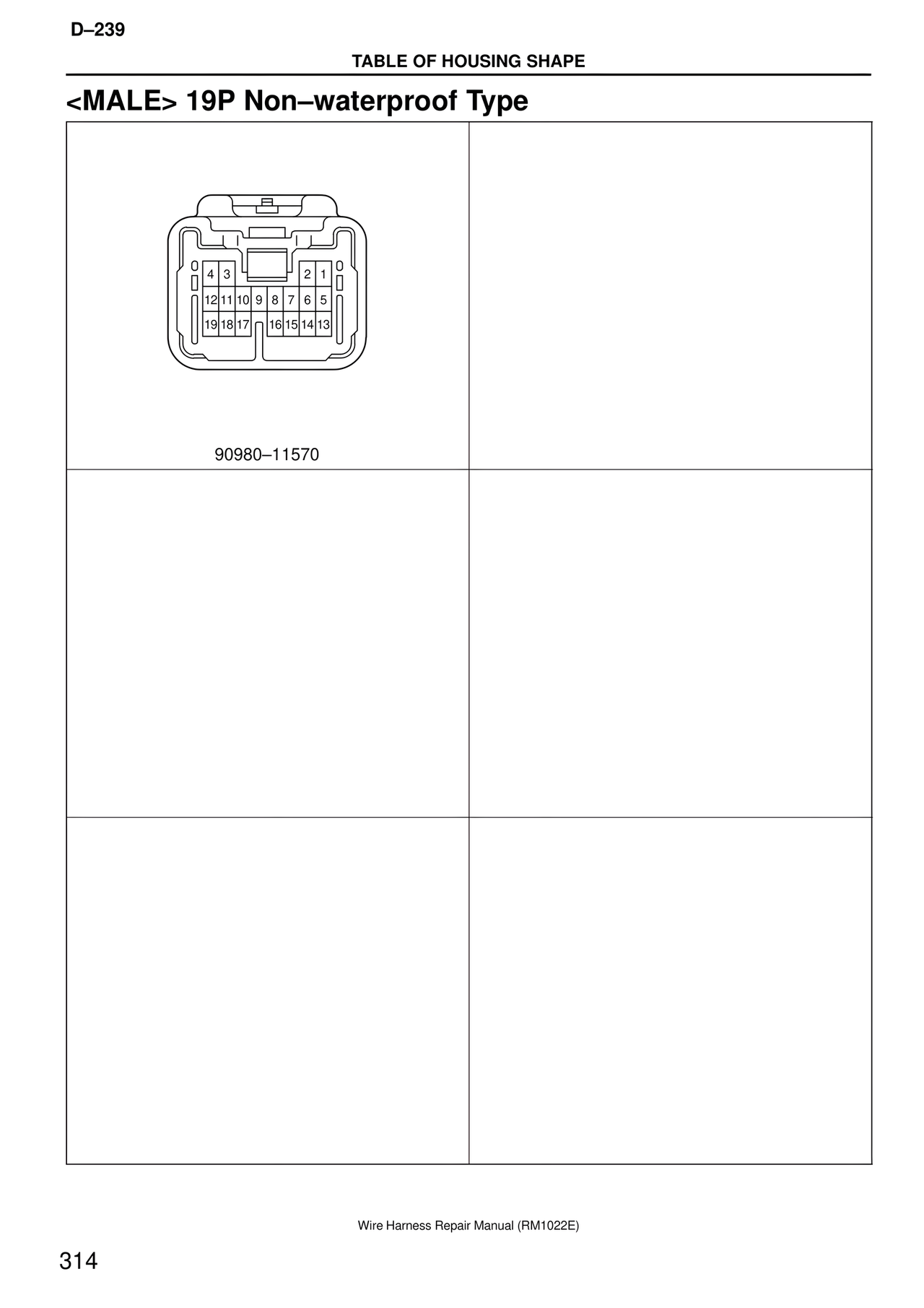 D–239 TABLE OF HOUSING SHAPE <MALE> 19P Non–waterproof Type 0 4 3 2 1 0 12 11 10 9 8 7 6 5 19 18 17 16 15 14 13 90980–11570 Wire Harness Repair Manual (RM1022E) 314