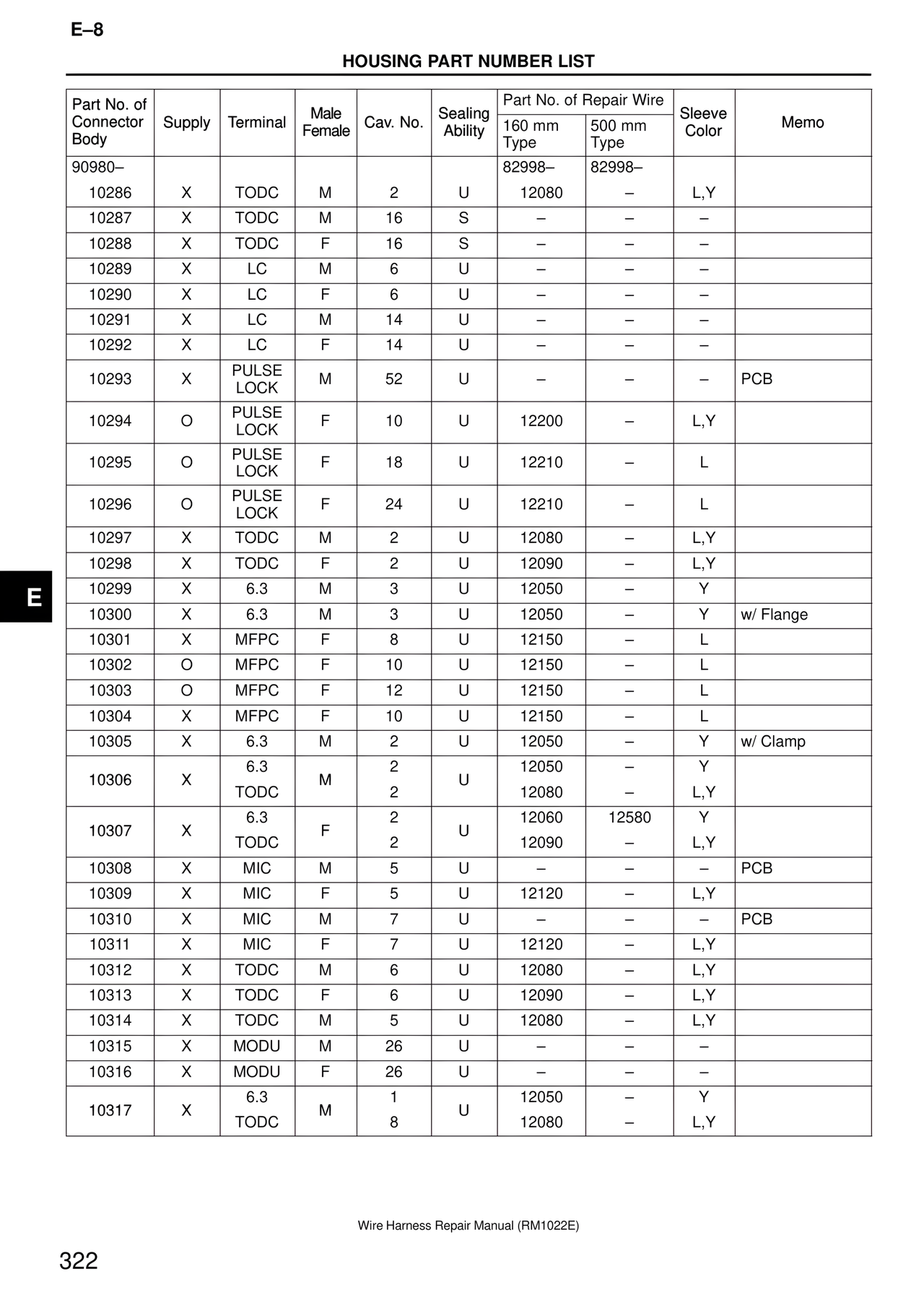Part No. of Connector Body | Supply | Terminal | Male Female | Cav. No. | Sealing Ability | Part No. of Repair Wire | Sleeve Color | Memo