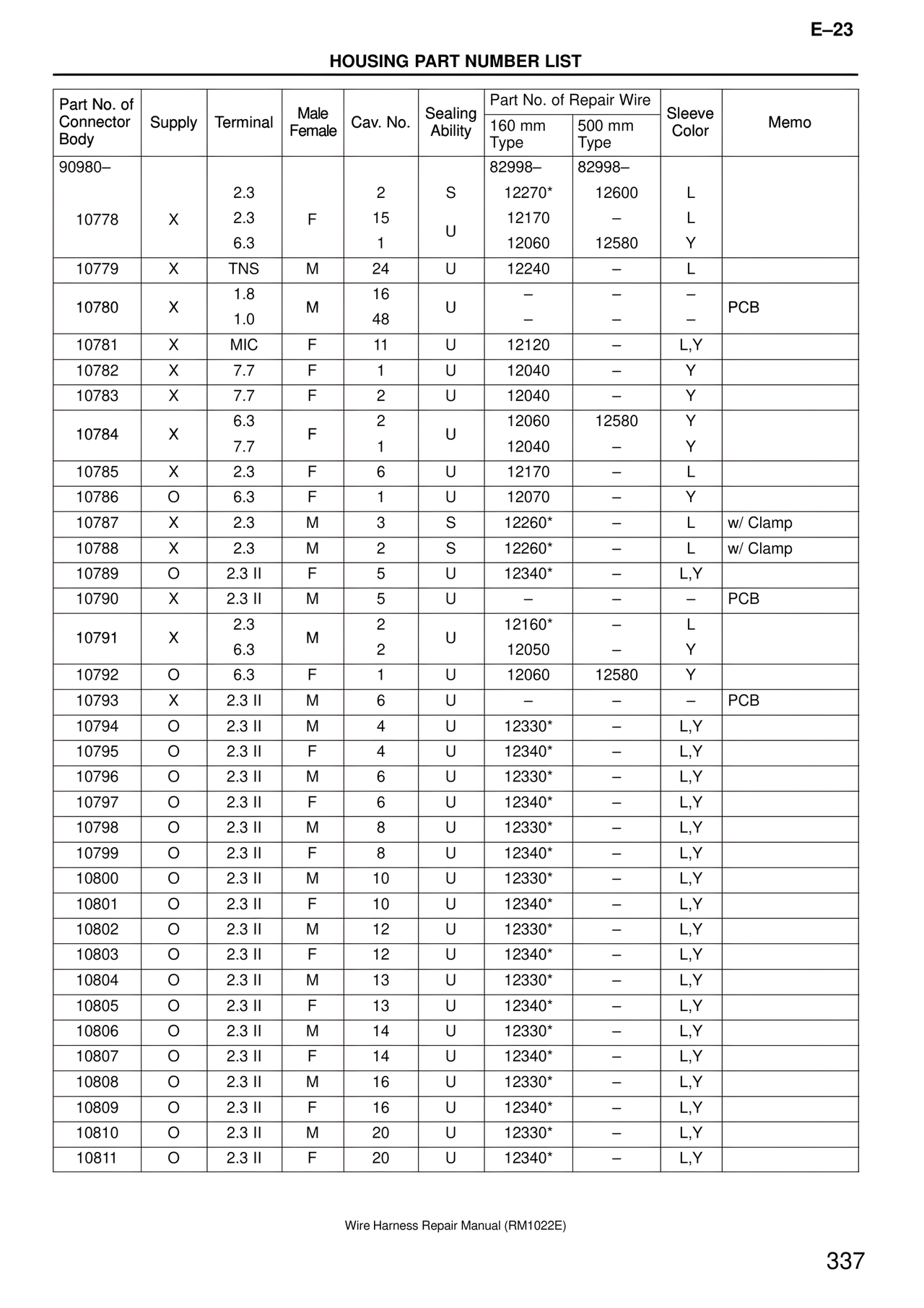 Part No. of Connector Body | Supply | Terminal | Male Female | Cav. No. | Sealing Ability | Part No. of Repair Wire 160 mm Type | Part No. of Repair Wire 500 mm Type | Sleeve Color | Memo