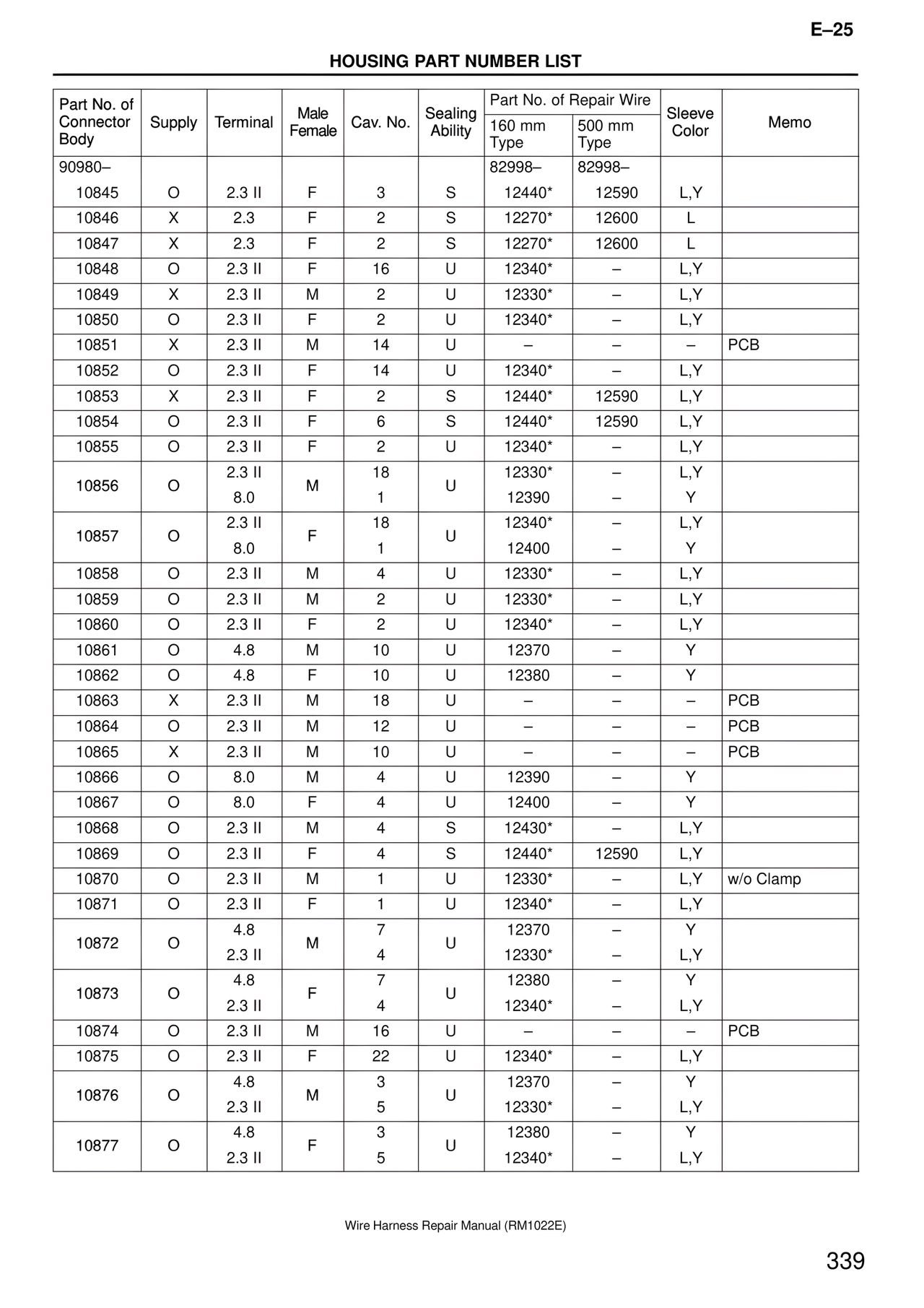 Part No. of Connector Body | Supply | Terminal | Male Female | Cav. No. | Sealing Ability | Part No. of Repair Wire 160 mm Type | Part No. of Repair Wire 500 mm Type | Sleeve Color | Memo