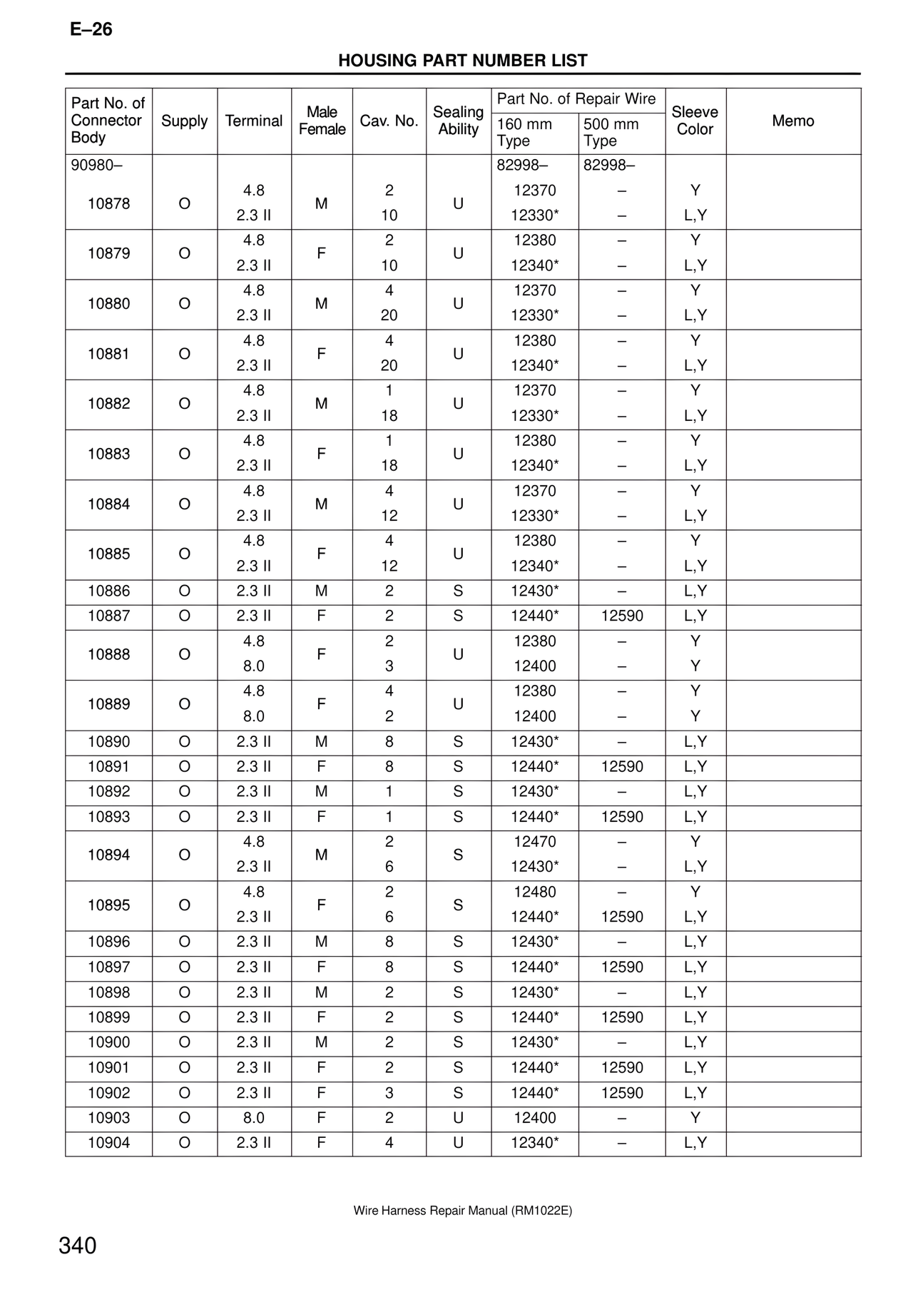 Part No. of Connector Body | Supply | Terminal | Male Female | Cav. No. | Sealing Ability | Part No. of Repair Wire 160 mm Type | Part No. of Repair Wire 500 mm Type | Sleeve Color | Memo
