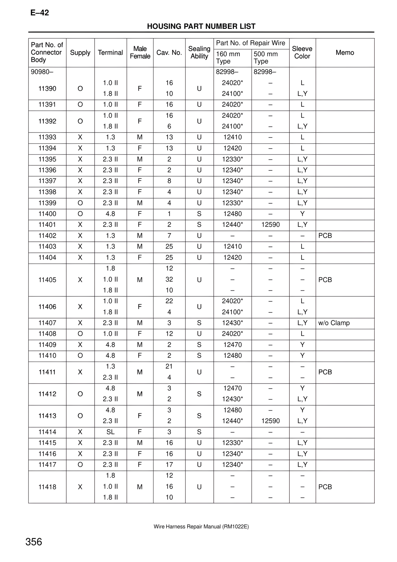 Part No. of Connector Body | Supply | Terminal | Male Female | Cav. No. | Sealing Ability | Part No. of Repair Wire 160 mm Type | Part No. of Repair Wire 500 mm Type | Sleeve Color | Memo