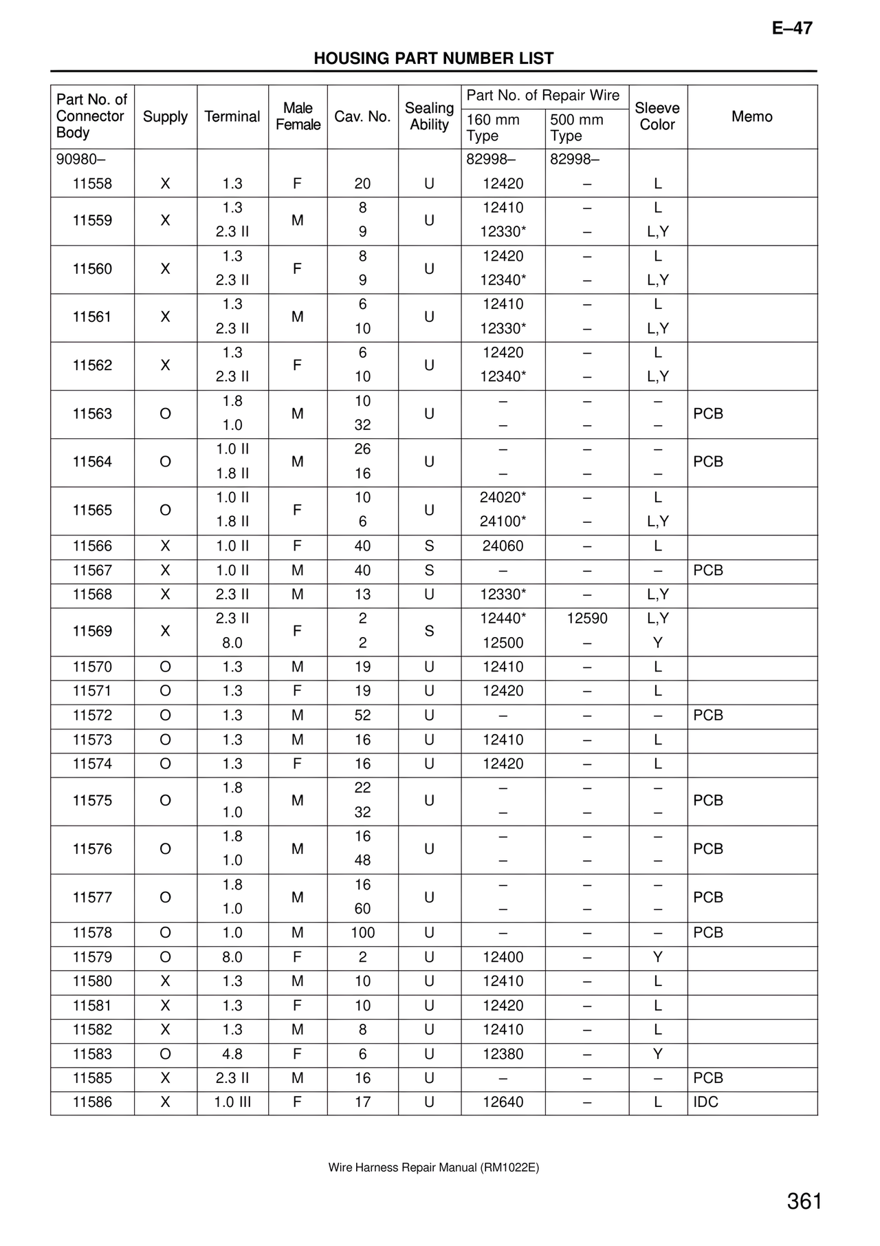 Part No. of Connector Body | Supply | Terminal | Male Female | Cav. No. | Sealing Ability | Part No. of Repair Wire 160 mm Type | Part No. of Repair Wire 500 mm Type | Sleeve Color | Memo