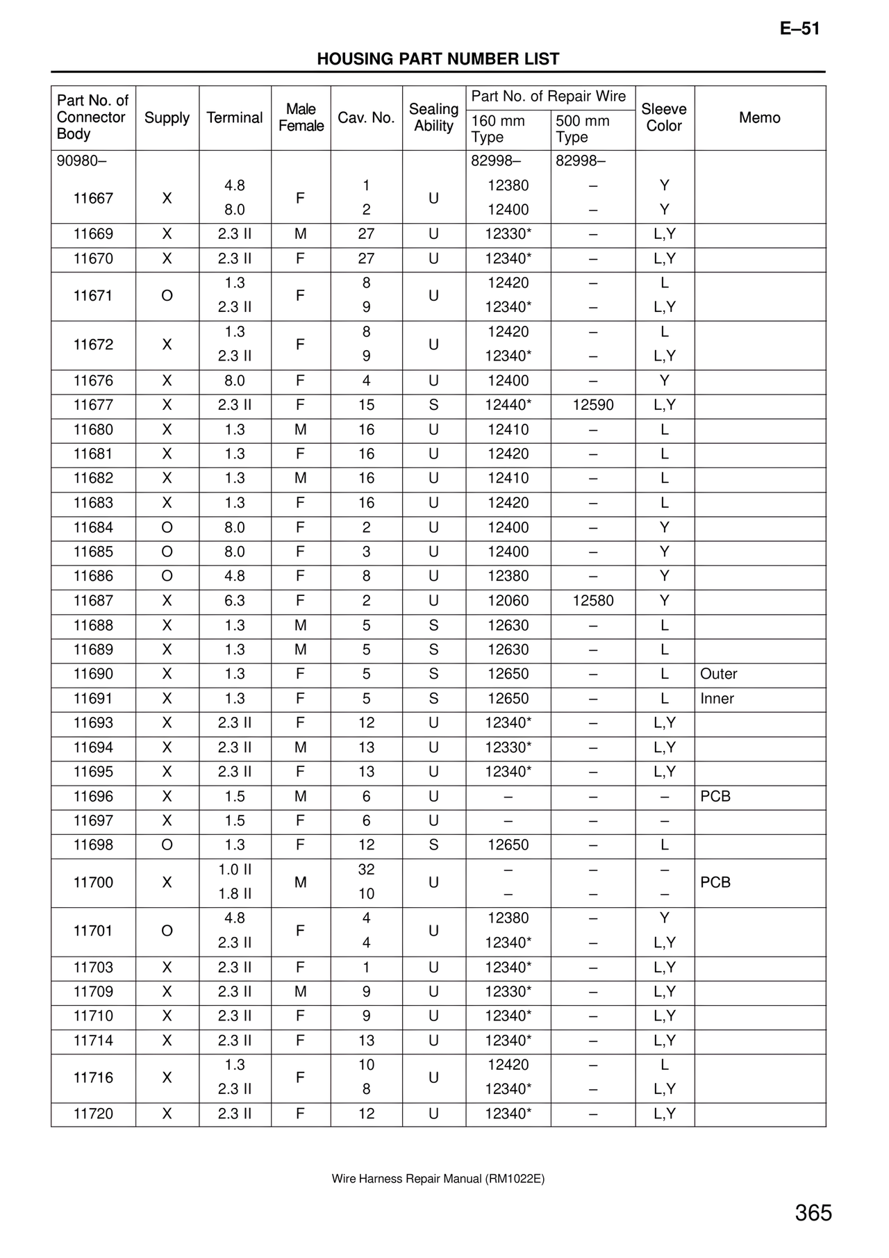Part No. of Connector Body | Supply | Terminal | Male Female | Cav. No. | Sealing Ability | Part No. of Repair Wire 160 mm Type | Part No. of Repair Wire 500 mm Type | Sleeve Color | Memo