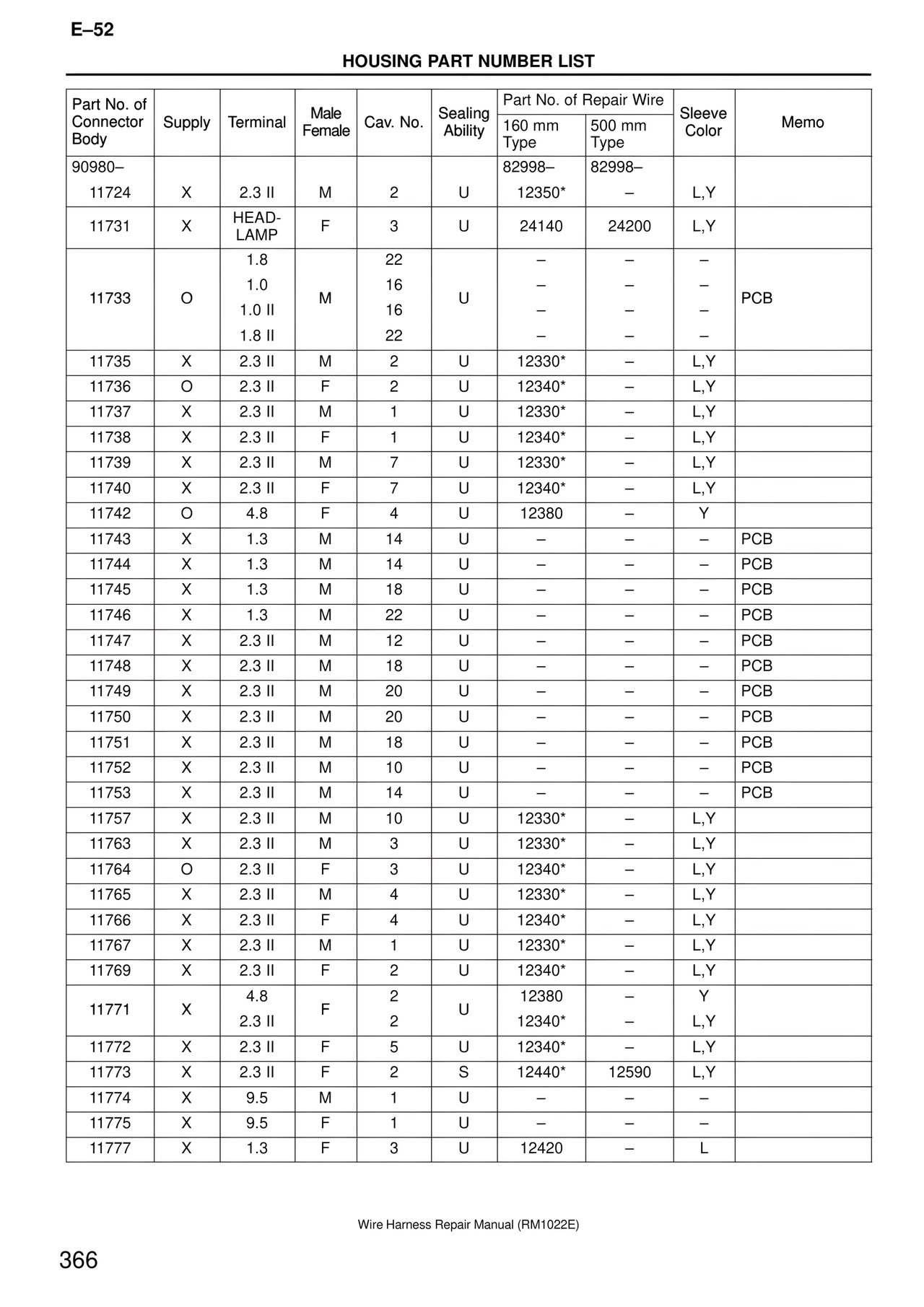 Part No. of Connector Body | Supply | Terminal | Male Female | Cav. No. | Sealing Ability | Part No. of Repair Wire 160 mm Type | Part No. of Repair Wire 500 mm Type | Sleeve Color | Memo