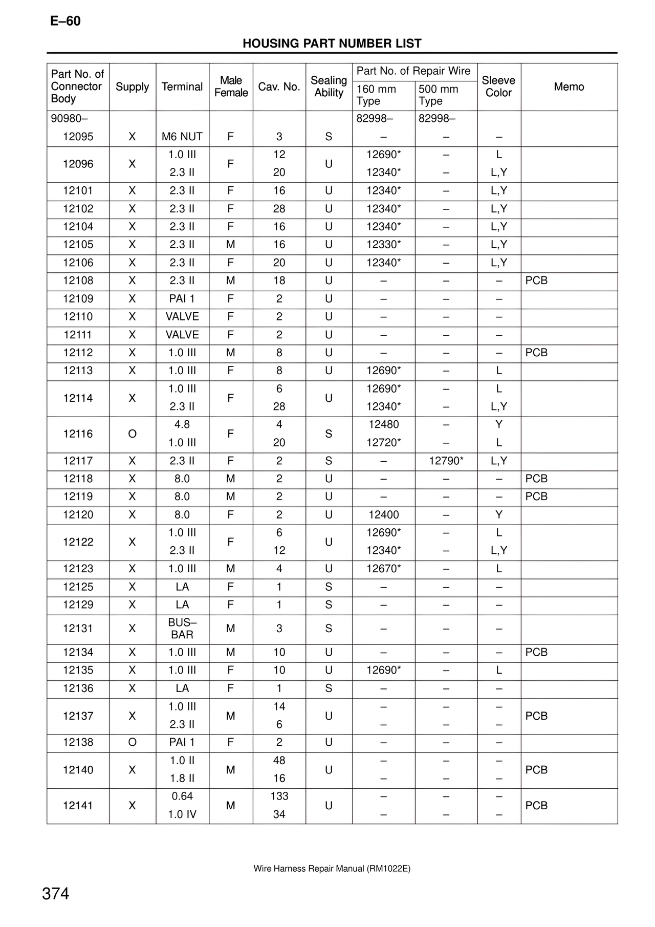 Part No. of Connector Body | Supply | Terminal | Male Female | Cav. No. | Sealing Ability | Part No. of Repair Wire 160 mm Type | Part No. of Repair Wire 500 mm Type | Sleeve Color | Memo