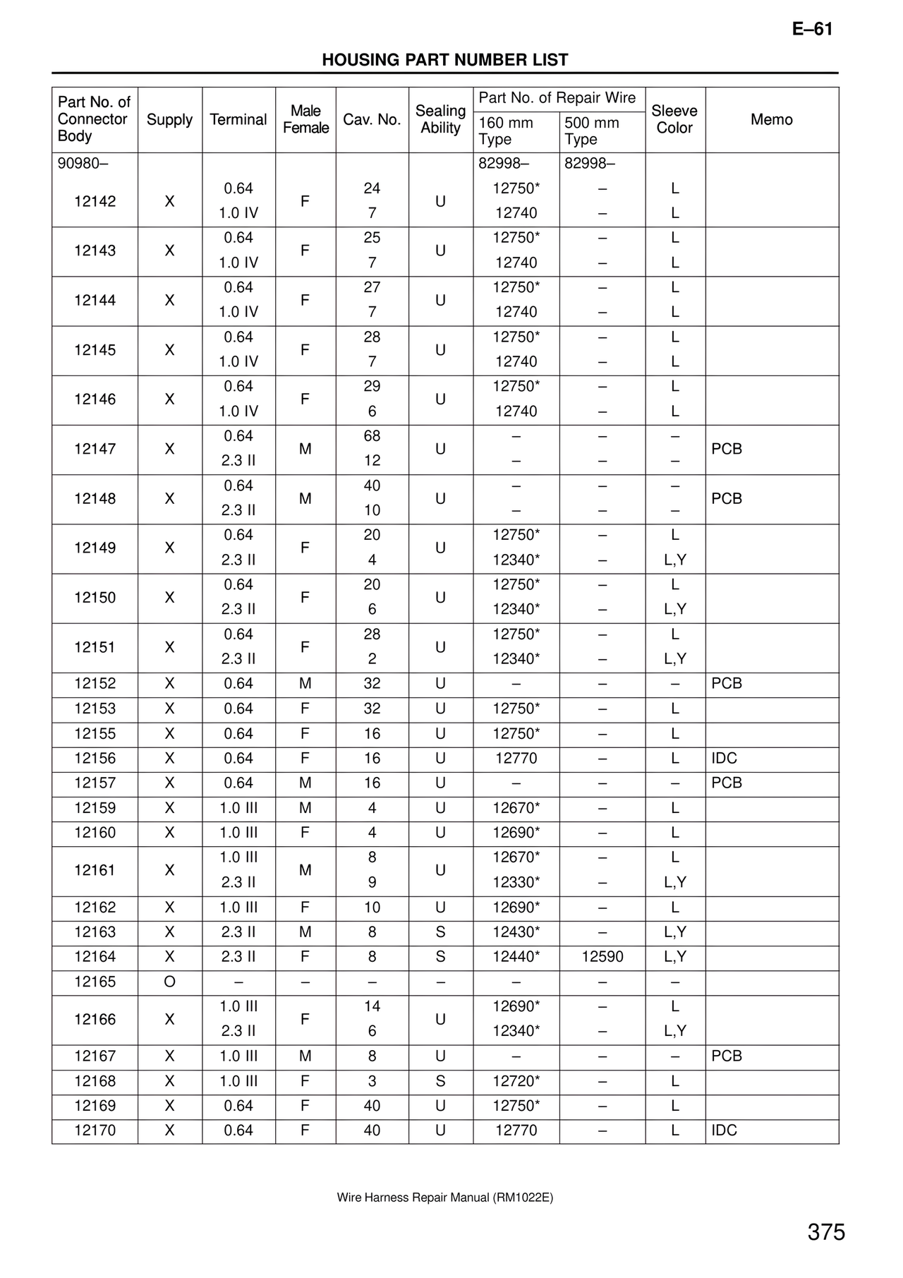 Part No. of Connector Body | Supply | Terminal | Male Female | Cav. No. | Sealing Ability | Part No. of Repair Wire 160 mm Type | Part No. of Repair Wire 500 mm Type | Sleeve Color | Memo