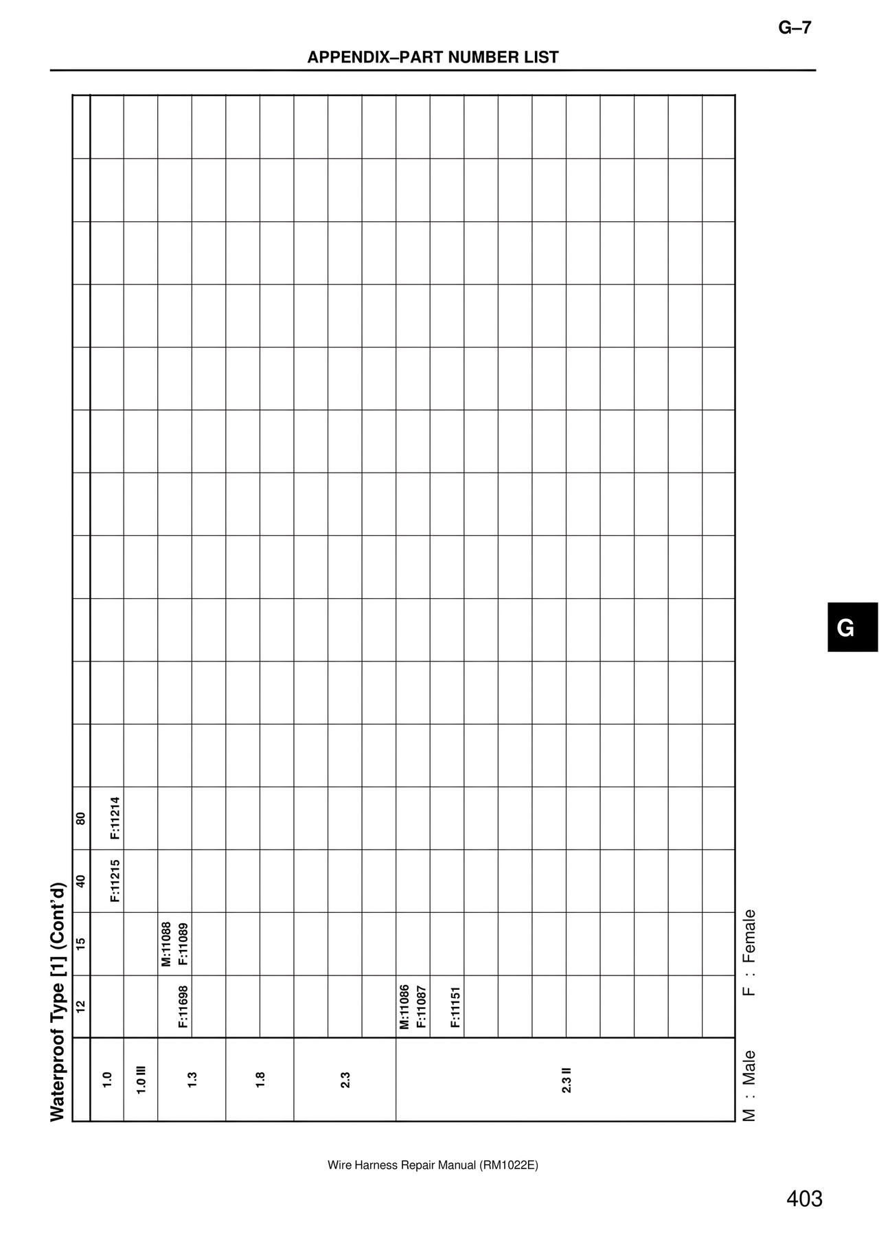 G–7 APPENDIX–PART NUMBER LIST Waterproof Type [1] (Cont'd) 1.0 1.0 III 1.3 1.8 2.3 2.3 II 12 F:11698 M:11086 F:11087 F:11151 15 M:11088 F:11089 40 F:11215 80 F:11214 M : Male F : Female Wire Harness Repair Manual (RM1022E) 403