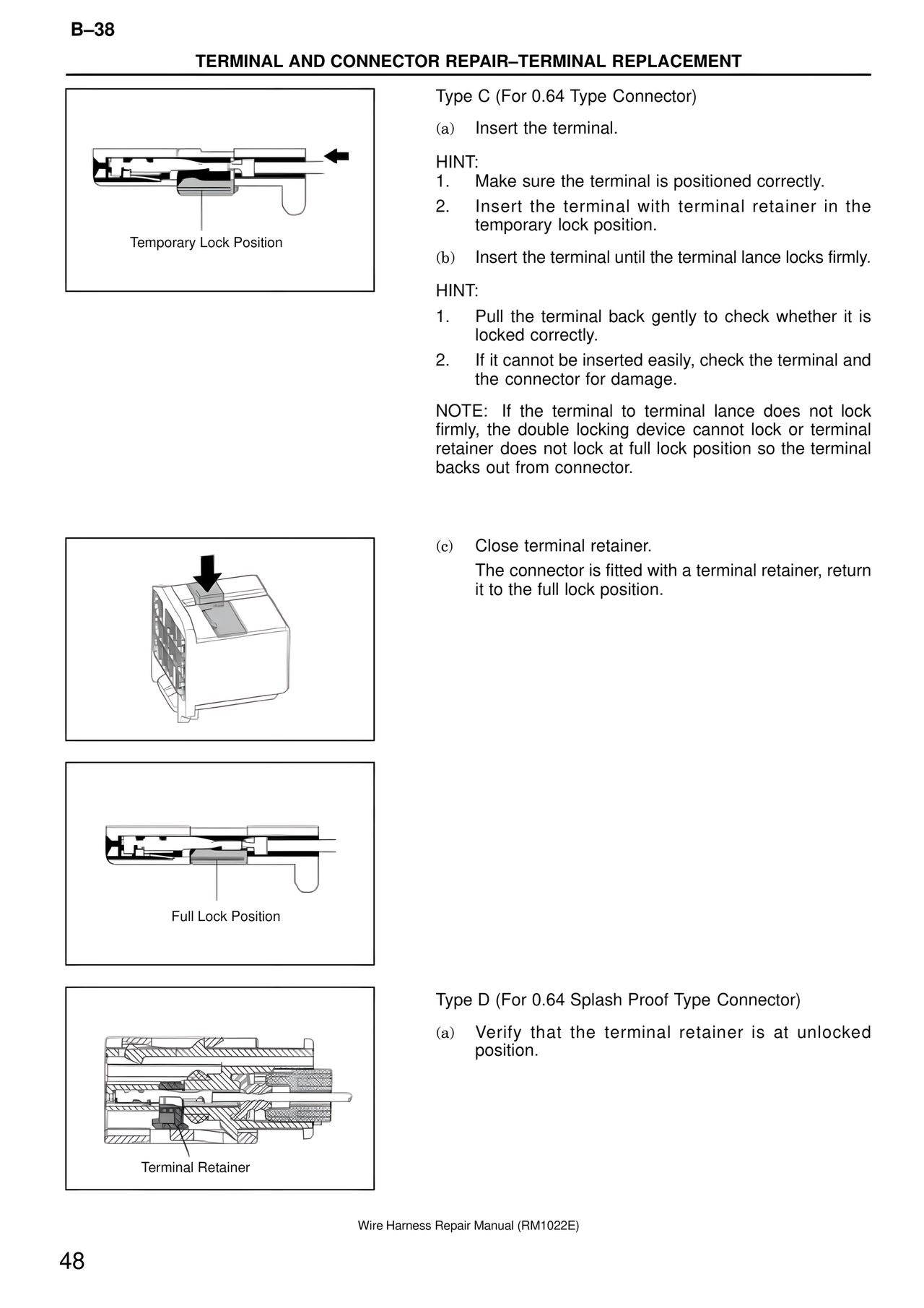 NOTE: If the terminal to terminal lance does not lock firmly, the double locking device cannot lock or terminal retainer does not lock at full lock position so the terminal backs out from connector.