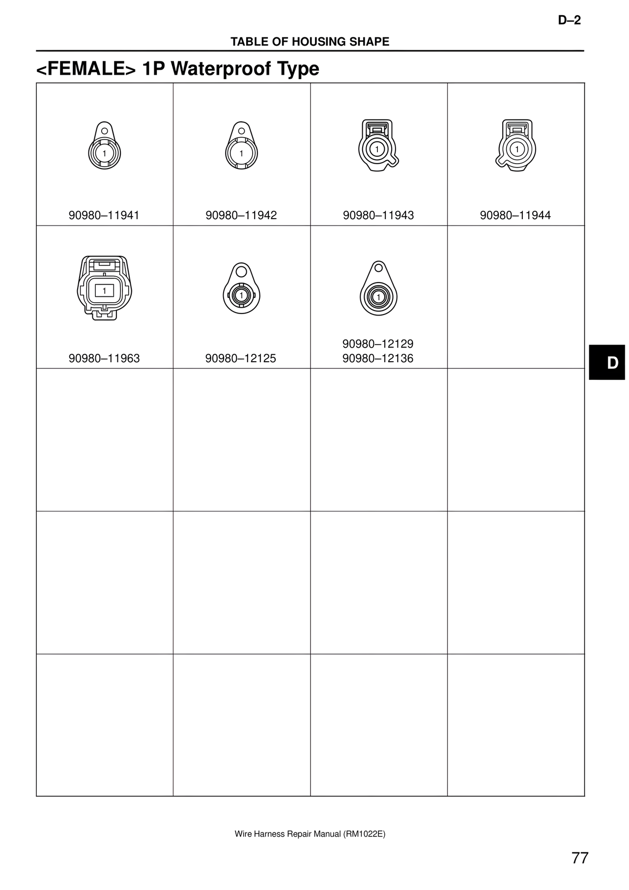 D–2 TABLE OF HOUSING SHAPE <FEMALE> 1P Waterproof Type 90980–11941 90980–11942 90980–11943 90980–11944 90980–11963 90980–12125 90980–12129 90980–12136 D Wire Harness Repair Manual (RM1022E) 77