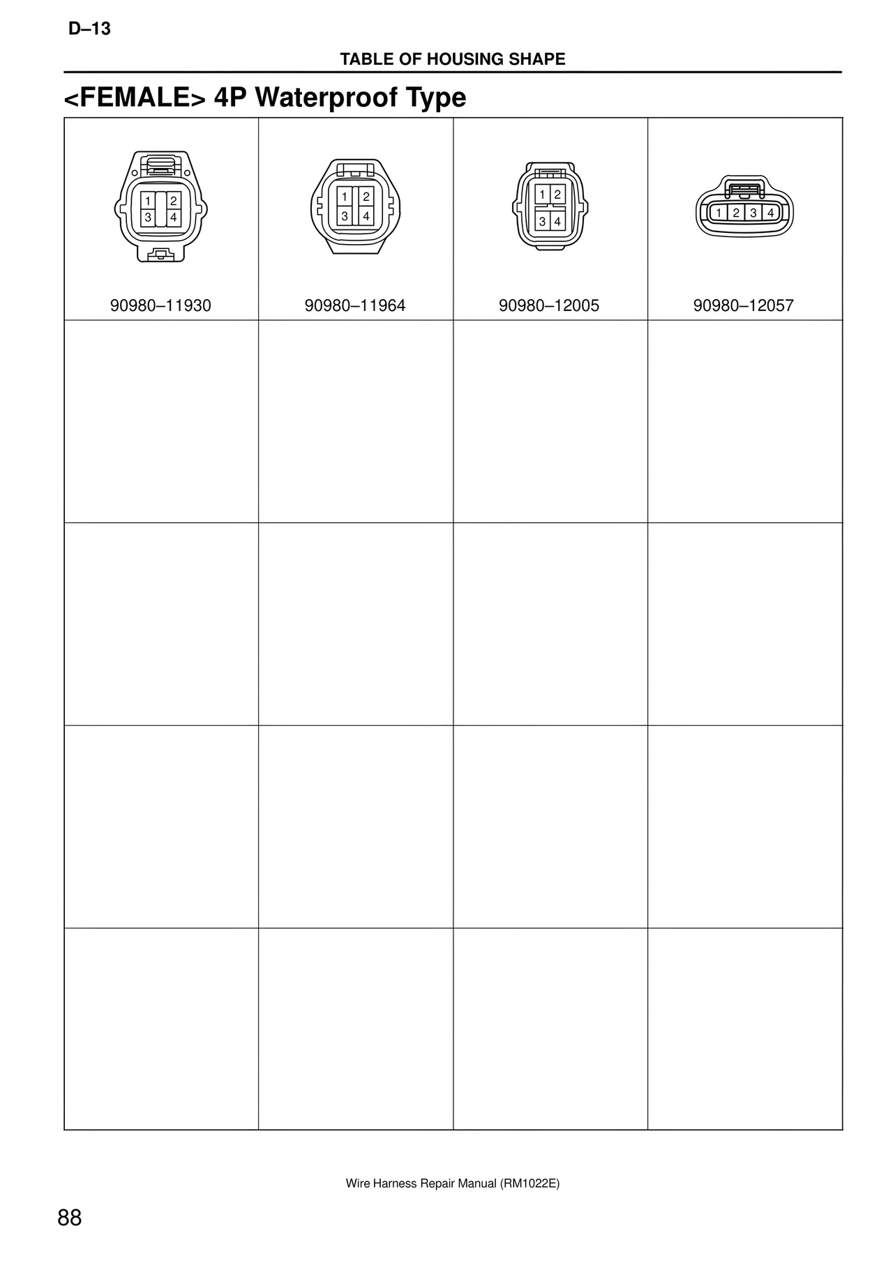 D–13 TABLE OF HOUSING SHAPE <FEMALE> 4P Waterproof Type 1 2 3 4 90980–11930 1 2 3 4 90980–11964 1 2 3 4 90980–12005 1 2 3 4 90980–12057 Wire Harness Repair Manual (RM1022E) 88