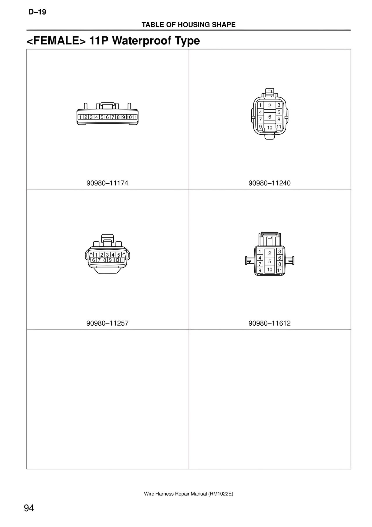 D–19 TABLE OF HOUSING SHAPE <FEMALE> 11P Waterproof Type 1 2 3 4 5 6 7 8 9 10 11 90980–11174 1 2 3 4 5 6 7 8 9 10 11 90980–11240 1 2 3 4 5 6 7 8 9 10 11 90980–11257 1 2 3 4 6 7 5 8 9 10 11 90980–11612 Wire Harness Repair Manual (RM1022E) 94