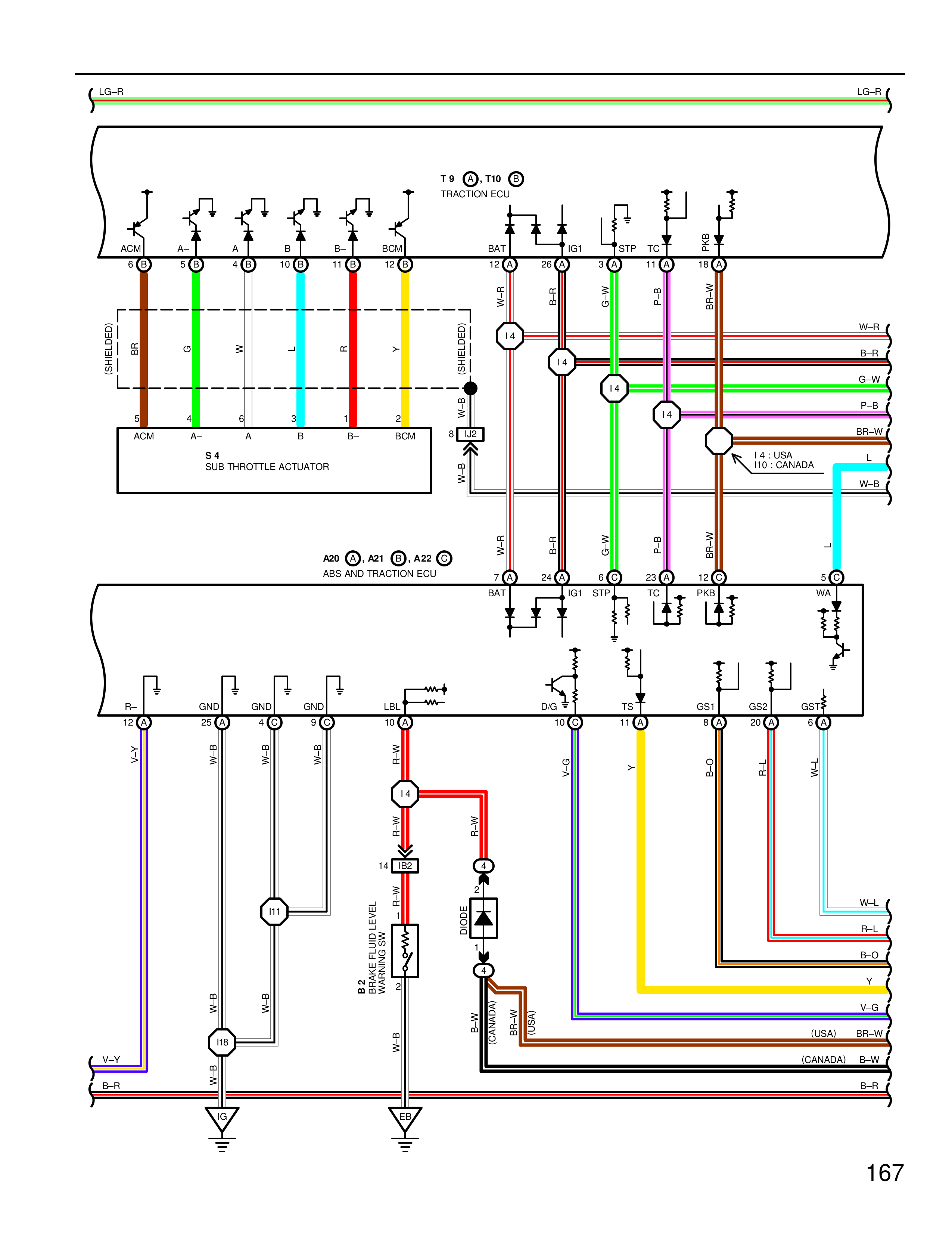LG-R LG-R T9 T10 D TRACTION ECU 6 8 4 16 11 12 BAT IG1 STP TC+ PKB TCM ECMI ECMI 12 25 3 11 18 W-R W-R B-R B-R BR G W L R Y W-R B-R G-W P-B BR-W ACM A- A B B- BCM 8 WS W-B 14 USA 10 CANADA L W-B S4 SUB THROTTLE ACTUATOR A20 A21 A22 C ABS AND TRACTION ECU 7 24 6 23 12 5 BAT IG1 STP TC+ PKB WA R- GND GND GND LBL DG TS GS1 GS2 GSTB 13 25 4 10 19 11 8 20 21 V-Y W-B W-B W-B B-W V-G Y B-O R-L W-L I4 I3 B2 BRAKE FLUID LEVEL WARNING SW DOSE I2 I1 W-R W-B W-B B-W BR-W (CANADA) BR-W V-G (USA) BR-W Y V-Y B-O (CANADA) B-W B-R W-L R-L B-R B-R 167