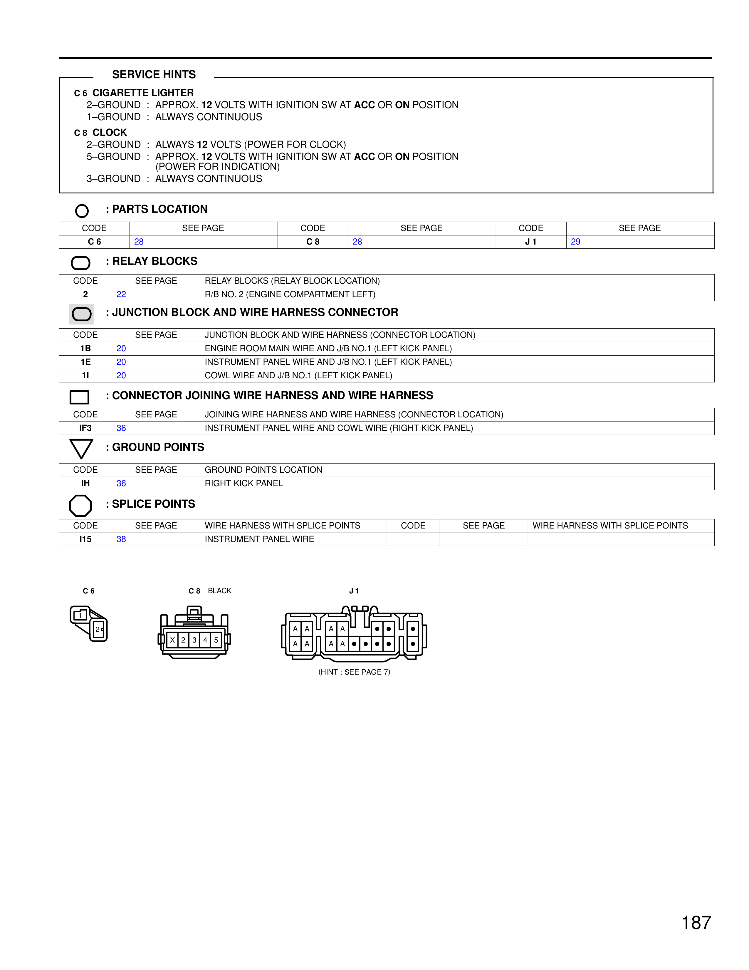 CODE | SEE PAGE | JUNCTION BLOCK AND WIRE HARNESS (CONNECTOR LOCATION)