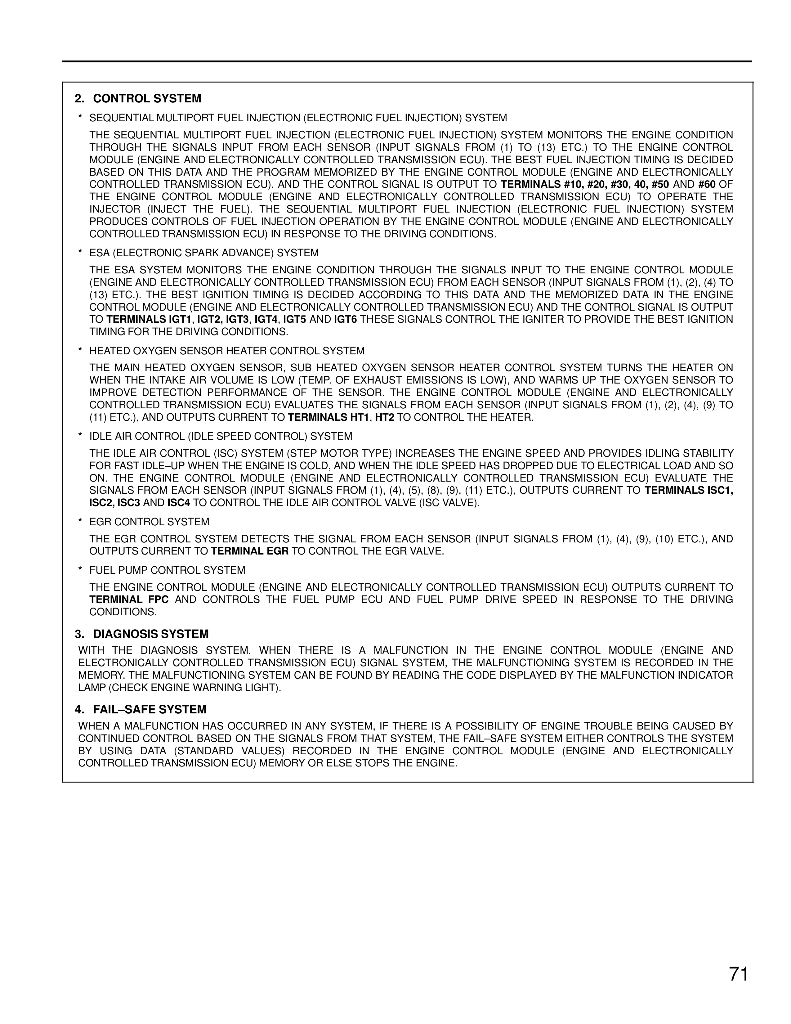 THE ESA SYSTEM MONITORS THE ENGINE CONDITION THROUGH THE SIGNALS INPUT TO THE ENGINE CONTROL MODULE (ENGINE AND ELECTRONICALLY CONTROLLED TRANSMISSION ECU) FROM EACH SENSOR (INPUT SIGNALS FROM (1), (2), (4) TO (13) ETC.). THE BEST IGNITION TIMING IS DECIDED ACCORDING TO THIS DATA AND THE MEMORIZED DATA IN THE ENGINE CONTROL MODULE (ENGINE AND ELECTRONICALLY CONTROLLED TRANSMISSION ECU) AND THE CONTROL SIGNAL IS OUTPUT TO TERMINALS IGT1, IGT2, IGT3, IGT4, IGT5 AND IGT6 THESE SIGNALS CONTROL THE IGNITER TO PROVIDE THE BEST IGNITION TIMING FOR THE DRIVING CONDITIONS.