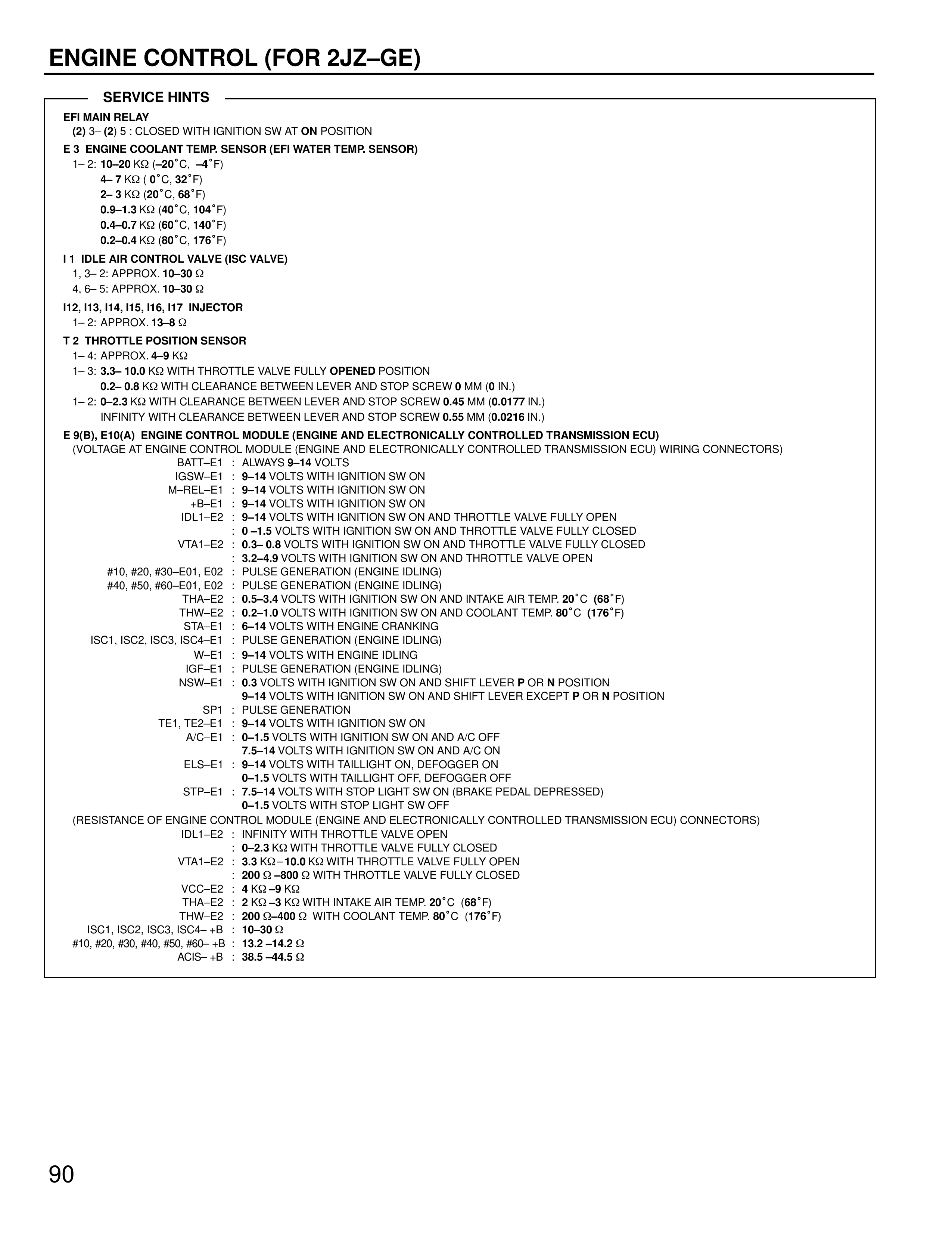 IDL1–E2 : 9–14 VOLTS WITH IGNITION SW ON AND THROTTLE VALVE FULLY OPEN