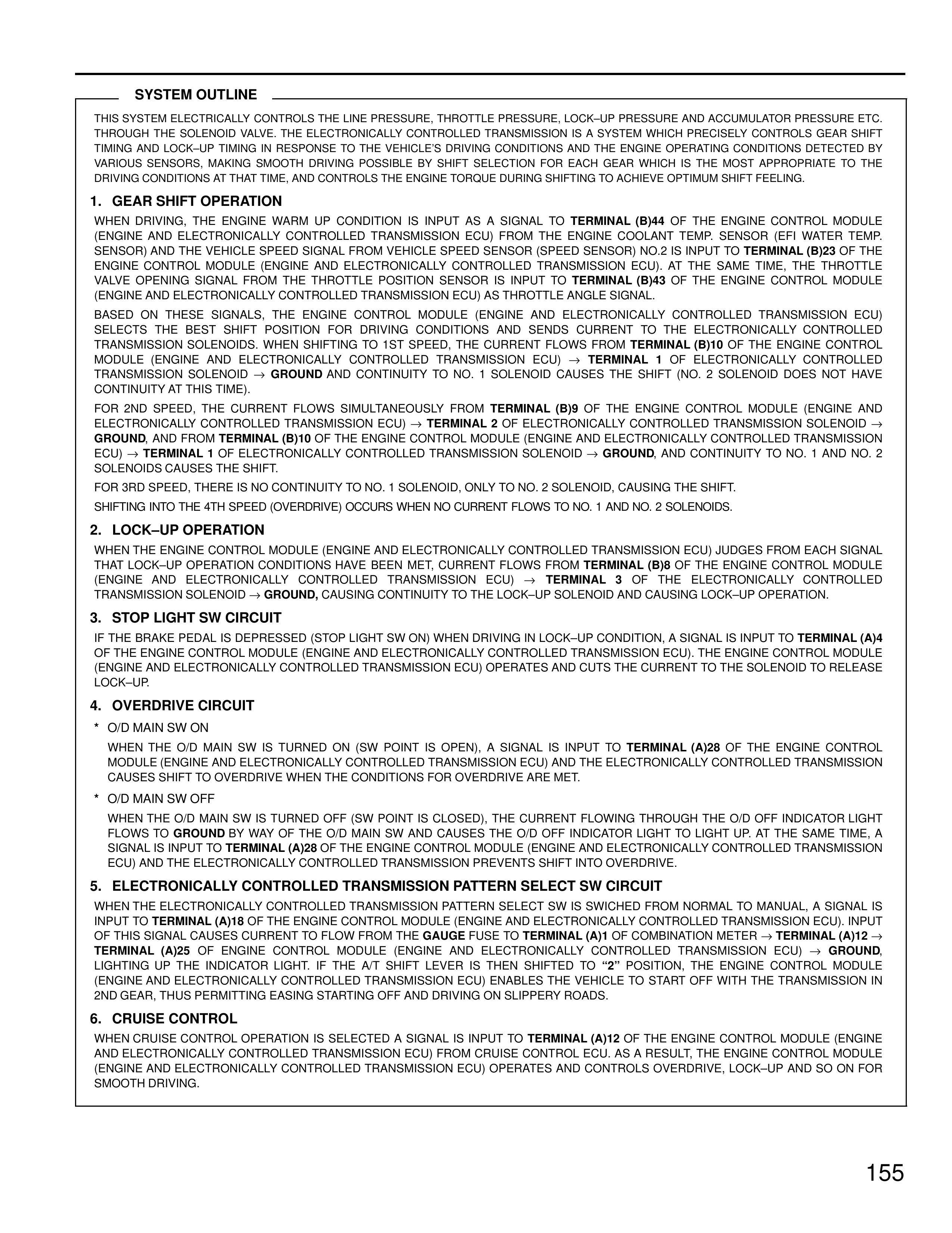 THIS SYSTEM ELECTRICALLY CONTROLS THE LINE PRESSURE, THROTTLE PRESSURE, LOCK-UP PRESSURE AND ACCUMULATOR PRESSURE ETC. THROUGH THE SOLENOID VALVE. THE ELECTRONICALLY CONTROLLED TRANSMISSION IS A SYSTEM WHICH PRECISELY CONTROLS GEAR SHIFT TIMING AND LOCK-UP TIMING IN RESPONSE TO THE VEHICLE'S DRIVING CONDITIONS AND THE ENGINE OPERATING CONDITIONS DETECTED BY VARIOUS SENSORS, MAKING SMOOTH DRIVING POSSIBLE BY SHIFT SELECTION FOR EACH GEAR WHICH IS THE MOST APPROPRIATE TO THE DRIVING CONDITIONS AT THAT TIME, AND CONTROLS THE ENGINE TORQUE DURING SHIFTING TO ACHIEVE OPTIMUM SHIFT FEELING.