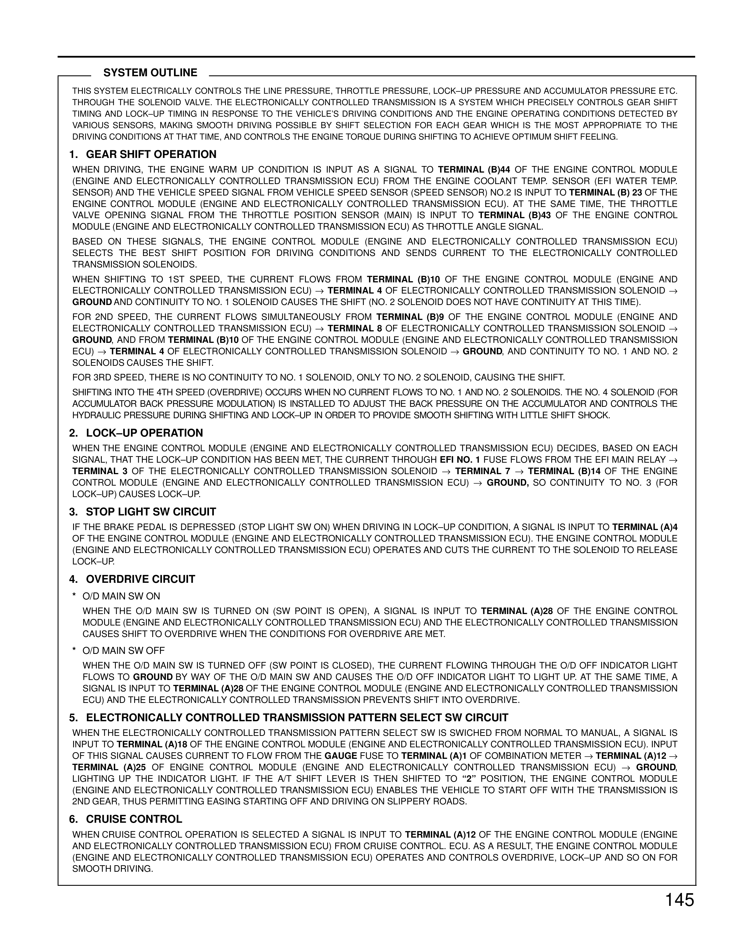 THIS SYSTEM ELECTRICALLY CONTROLS THE LINE PRESSURE, THROTTLE PRESSURE, LOCK-UP PRESSURE AND ACCUMULATOR PRESSURE ETC. THROUGH THE SOLENOID VALVE. THE ELECTRONICALLY CONTROLLED TRANSMISSION IS A SYSTEM WHICH PRECISELY CONTROLS GEAR SHIFT TIMING AND LOCK-UP TIMING IN RESPONSE TO THE VEHICLE'S DRIVING CONDITIONS AND THE ENGINE OPERATING CONDITIONS DETECTED BY VARIOUS SENSORS, MAKING SMOOTH DRIVING POSSIBLE BY SHIFT SELECTION FOR EACH GEAR WHICH IS THE MOST APPROPRIATE TO THE DRIVING CONDITIONS AT THAT TIME, AND CONTROLS THE ENGINE TORQUE DURING SHIFTING TO ACHIEVE OPTIMUM SHIFT FEELING.