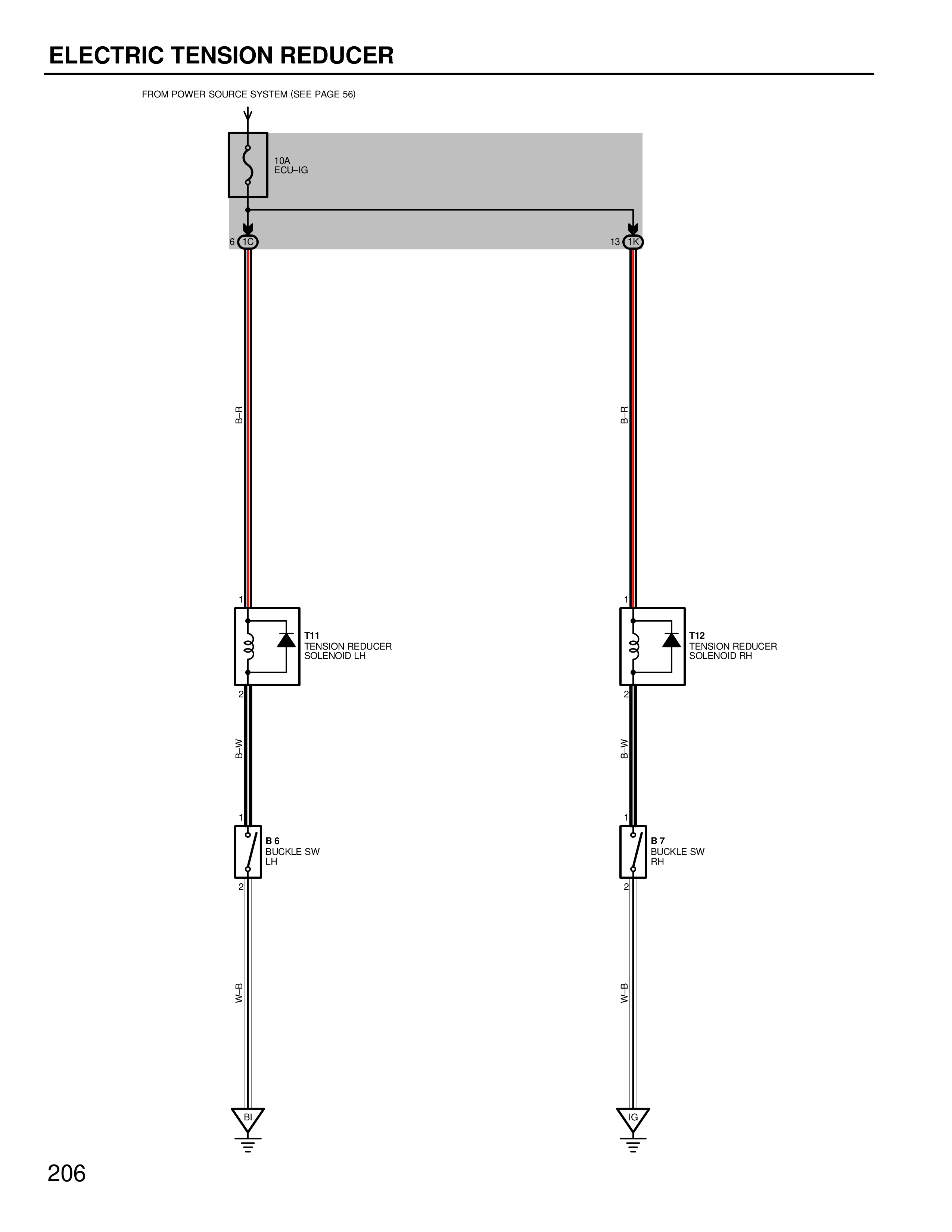 ELECTRIC TENSION REDUCER FROM POWER SOURCE SYSTEM (SEE PAGE 56) 10A ECU-IG B-R B-R 6 LC 13 LC T11 TENSION REDUCER SOLENOID LH T12 TENSION REDUCER SOLENOID RH B-W B-W B 6 BUCKLE SW LH B 7 BUCKLE SW RH W-B W-B 206