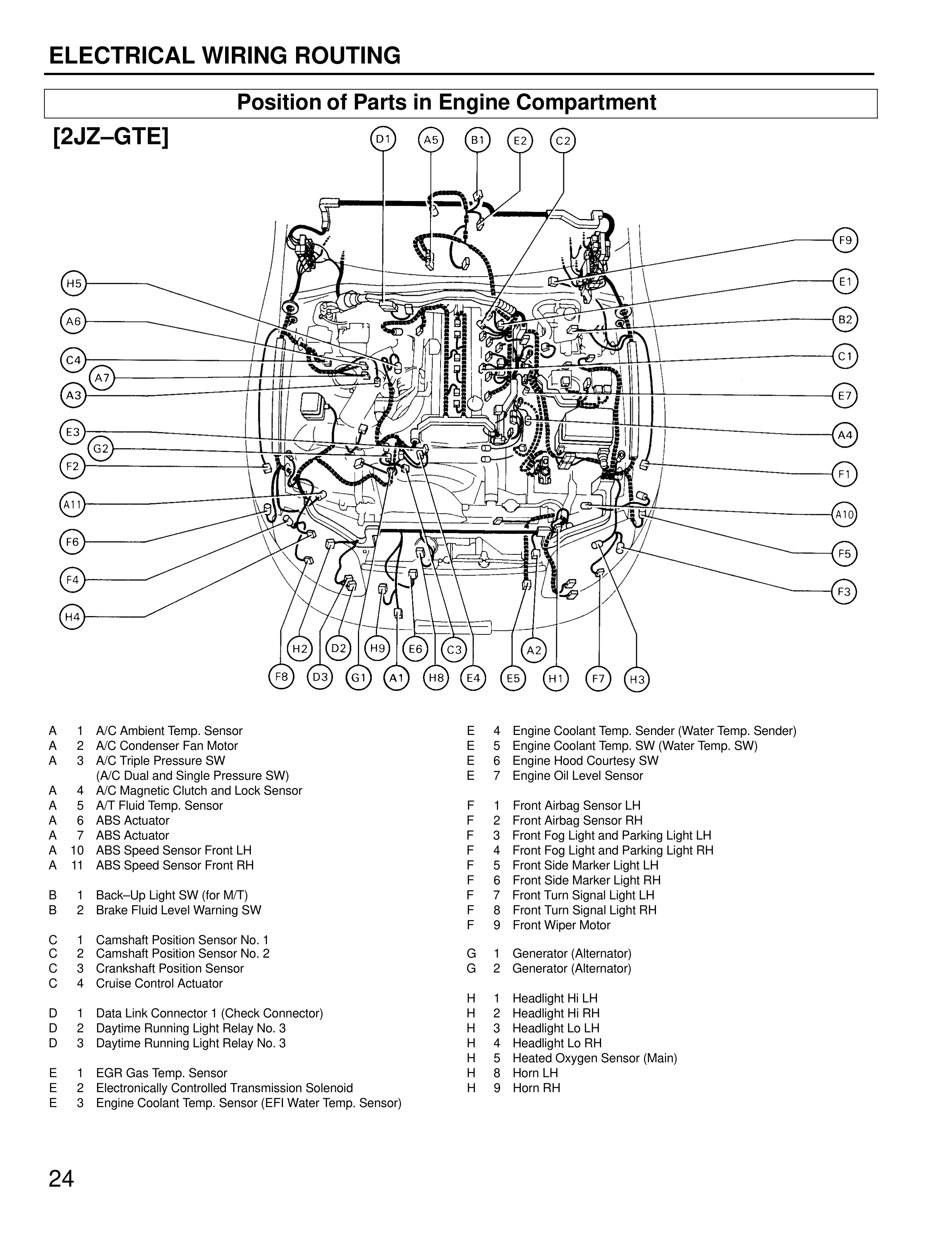 [Diagram shows engine compartment with labeled connector positions: D1, A9, B1, C, C2, F3, E1, H5, A6, B2, C4, C1, A7, E7, A3, E3, A4, G2, F2, E1, A1, A10, F6, F4, F5, H4, F3, H2, B2, H9, E6, C3, A2, F8, D3, G1, A1, H8, E4, E5, H1, F7, H3]