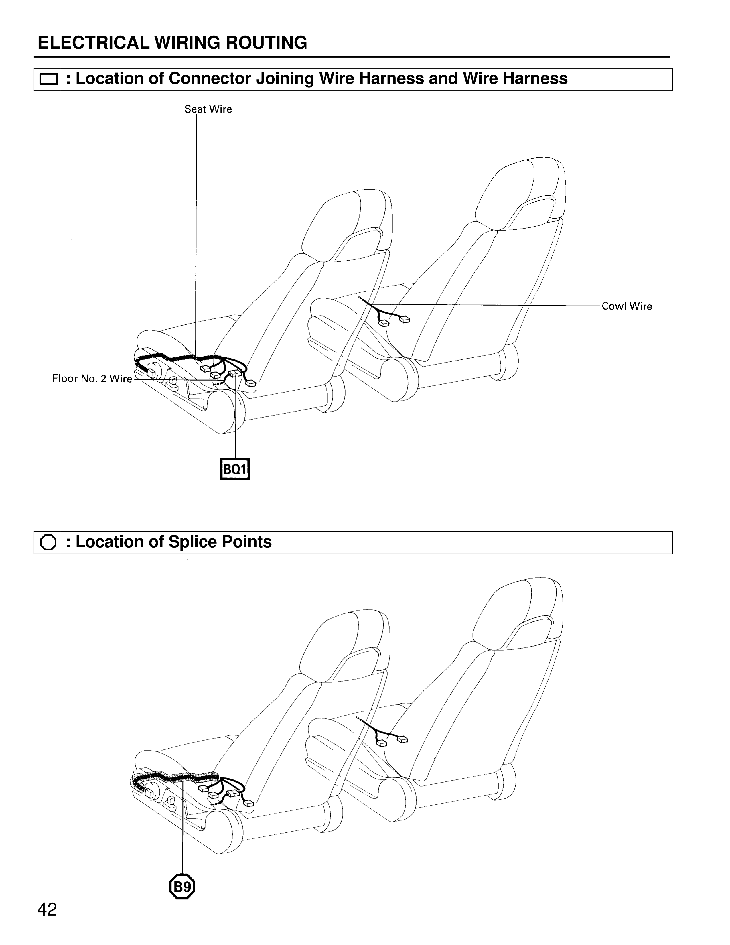 ELECTRICAL WIRING ROUTING : Location of Connector Joining Wire Harness and Wire Harness Seat Wire Cowl Wire Floor No. 2 Wire B01 : Location of Splice Points B9 42