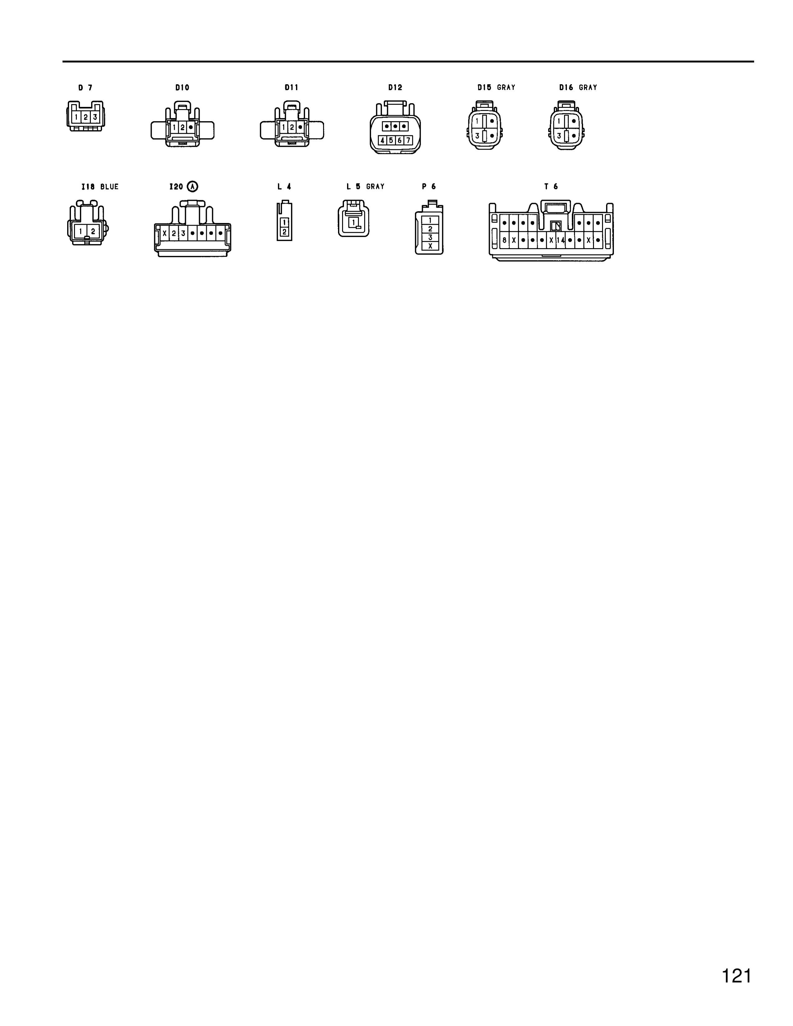D 7 D10 D11 D12 D18 GRAY D16 GRAY 118 BLUE 120 ① L 4 L 8 GRAY P 6 T 6 1 2 3 1 2 3 1 2 3 4 5 6 1 2 1 2 1 2 1 2 3 4 5 6 1 1 2 1 2 3 1 2 3 4 5 6 7 8 9 10 11 12 13 14 15 16 121
