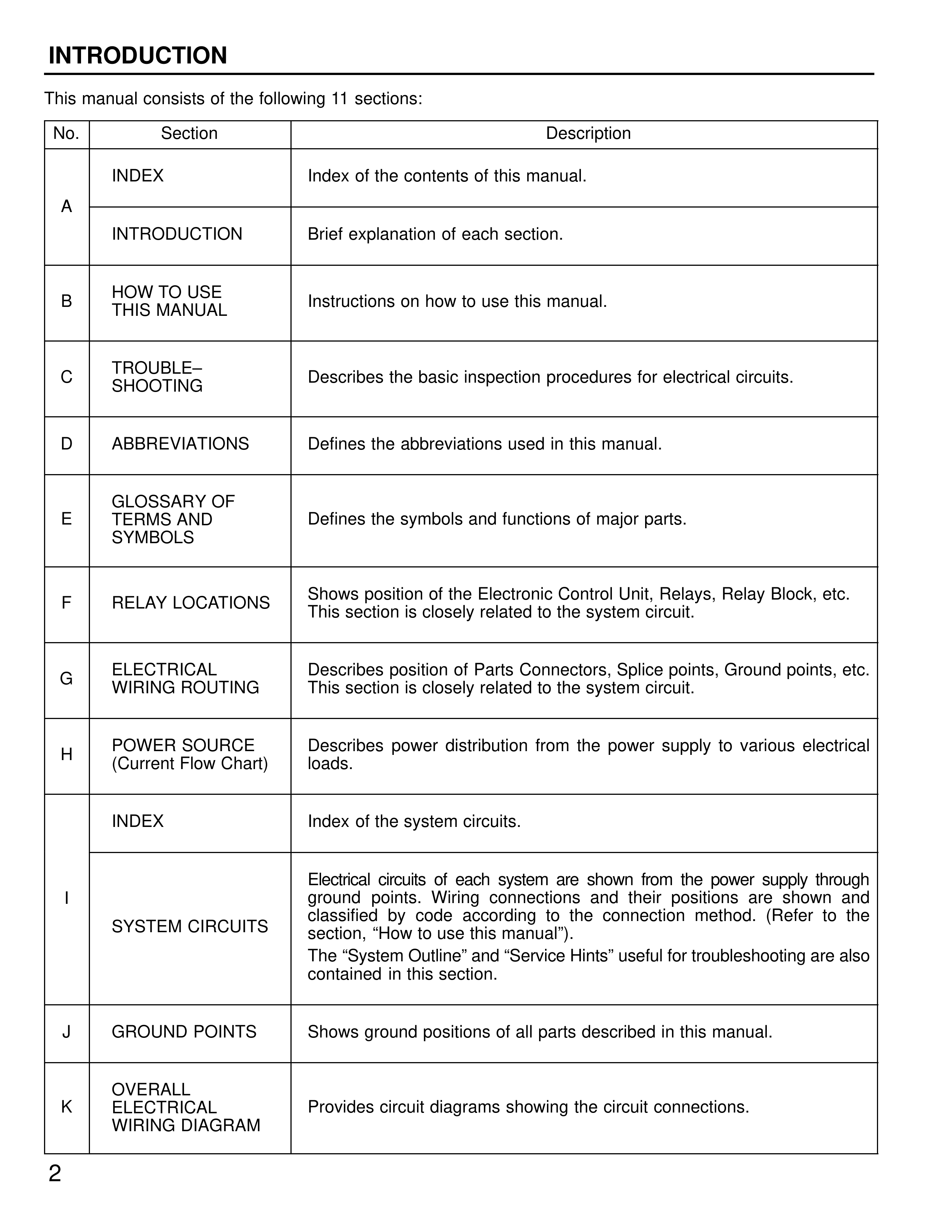I | SYSTEM CIRCUITS | Electrical circuits of each system are shown from the power supply through ground points. Wiring connections and their positions are shown and classified by code according to the connection method. (Refer to the section, "How to use this manual"). The "System Outline" and "Service Hints" useful for troubleshooting are also contained in this section.