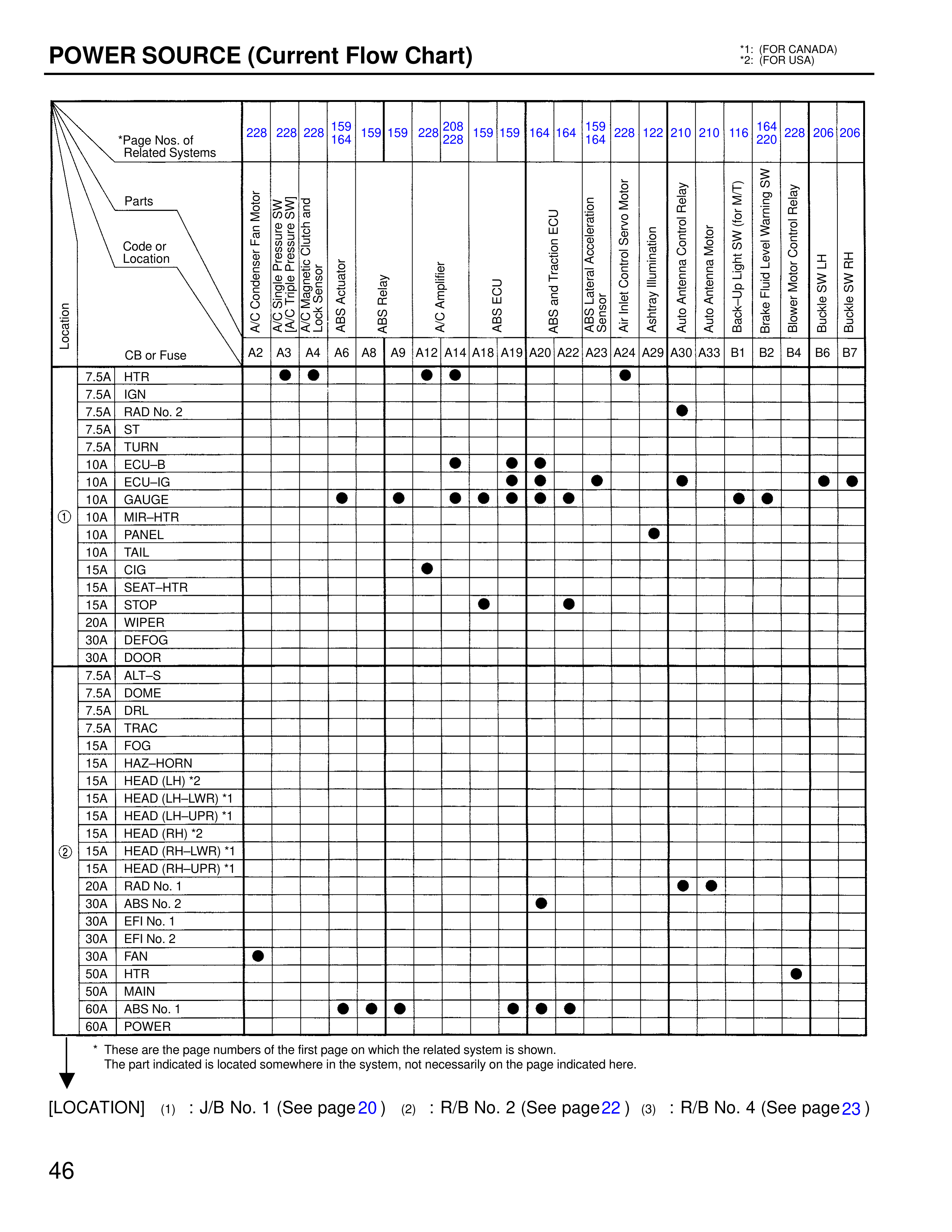 [LOCATION] (1) : J/B No. 1 (See page 20) (2) : R/B No. 2 (See page 22) (3) : R/B No. 4 (See page 23)