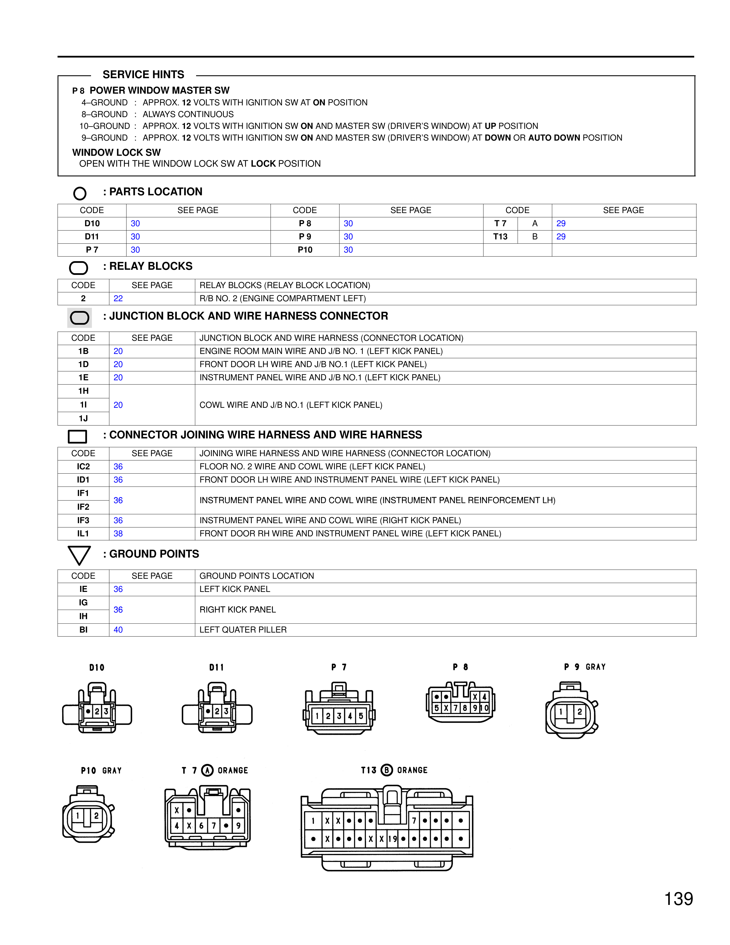 10–GROUND : APPROX. 12 VOLTS WITH IGNITION SW ON AND MASTER SW (DRIVER'S WINDOW) AT UP POSITION