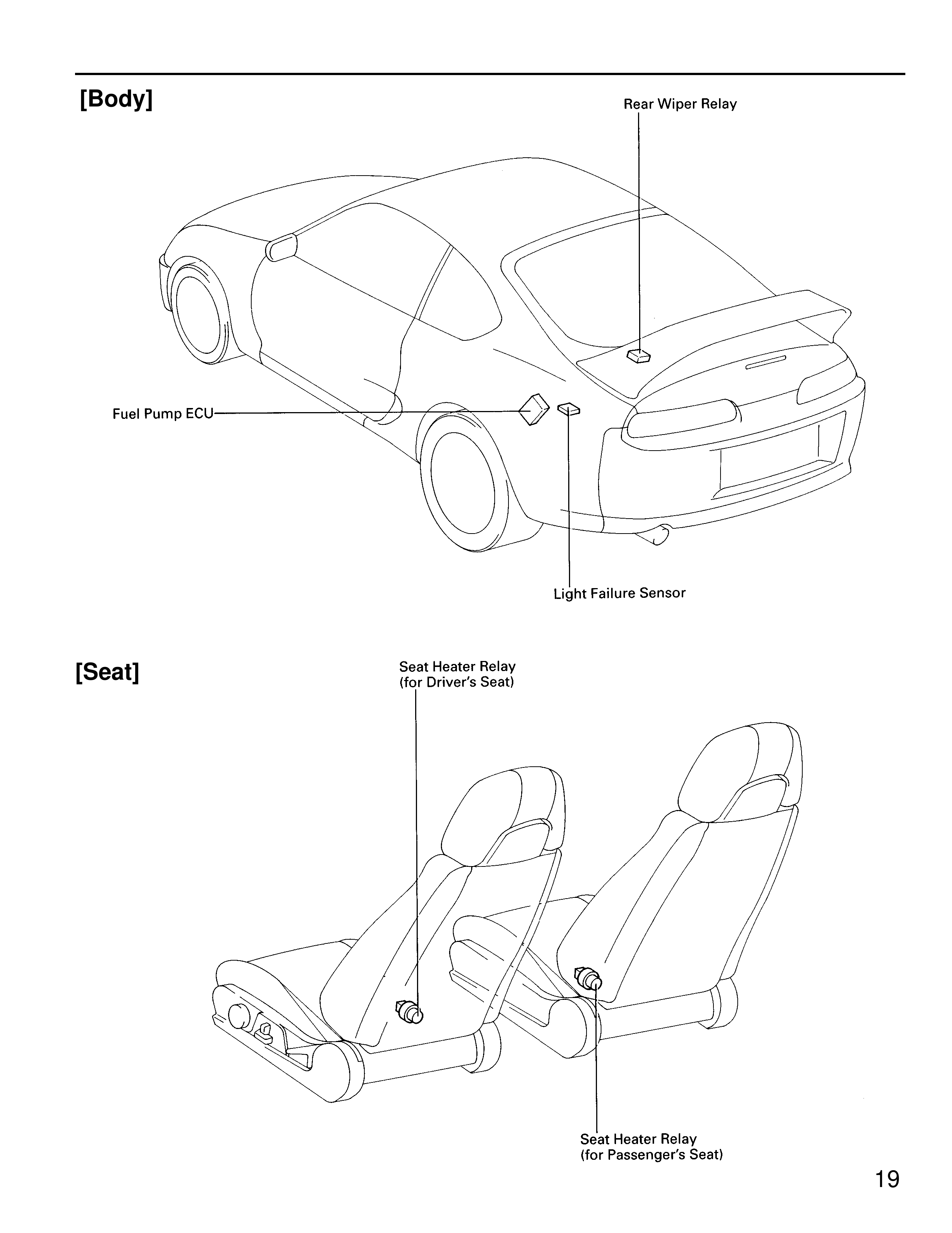 [Body] Rear Wiper Relay Fuel Pump ECU Light Failure Sensor [Seat] Seat Heater Relay (for Driver's Seat) Seat Heater Relay (for Passenger's Seat) 19