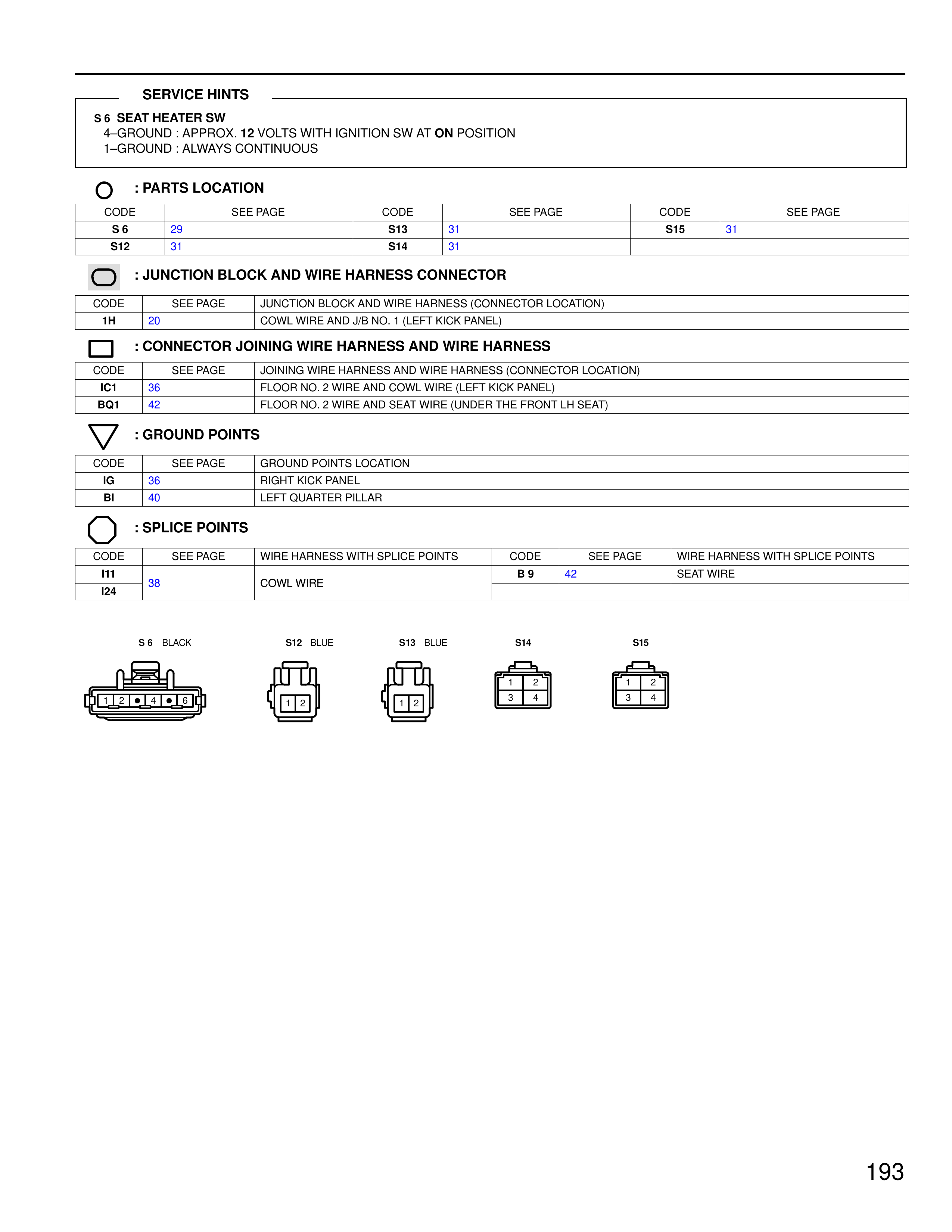 CODE | SEE PAGE | JUNCTION BLOCK AND WIRE HARNESS (CONNECTOR LOCATION)