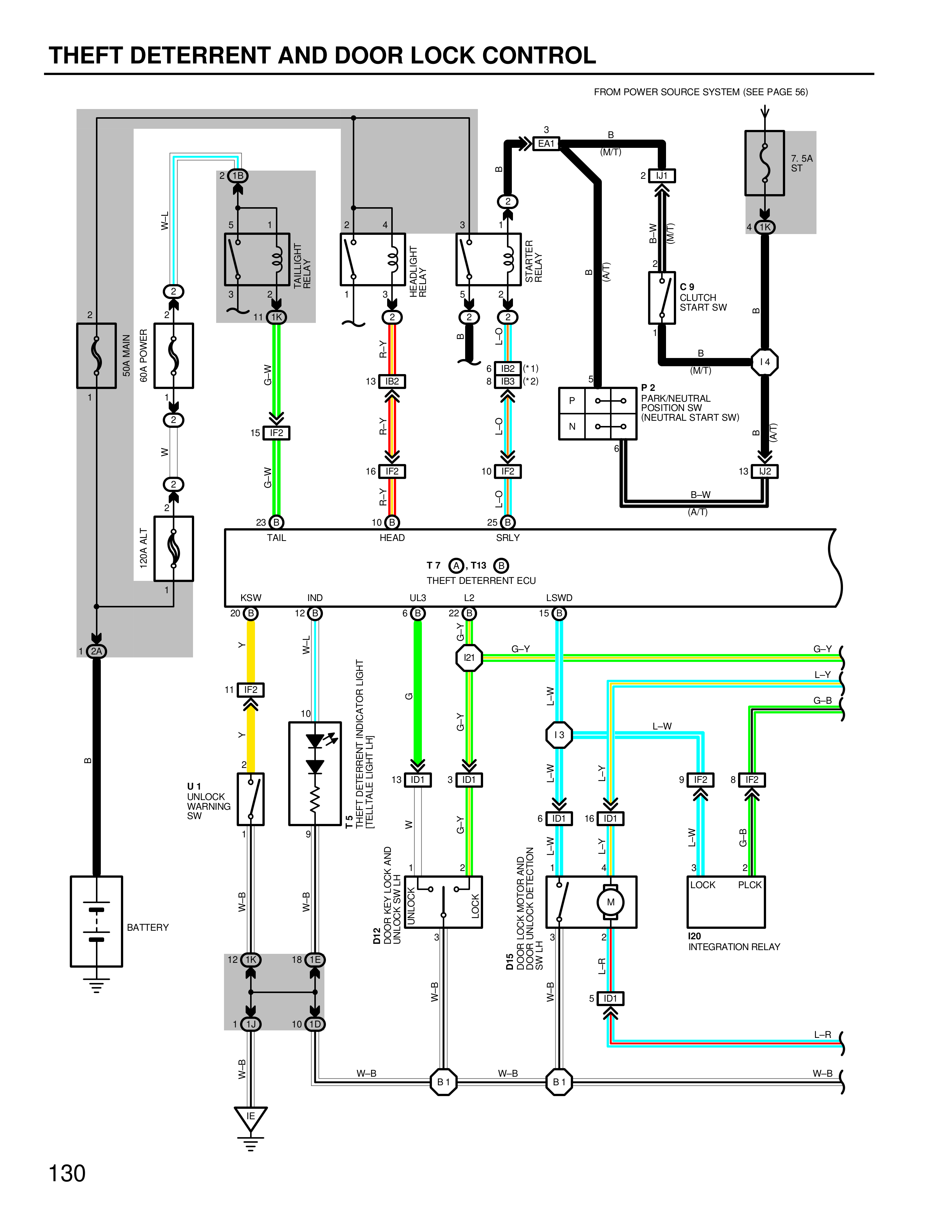 2 J/3 T-W 1 1 W J/2 11 J/3 J/2 J/2 J/2 19 J/2 18 J/32 (*1) J/32 (*2) G-W G-W 15 J/2 L-O 16 J/3 10 J/2 TAIL HEAD SRLY 23 O 10 O 25 O T7 O T13 G THEFT DETERRENT ECU KSW IND UL3 L2 LSWD 20 L 12 L 6 L 23 L 14 L Y W-I G-Y G-Y L-Y G-B L-W 11 J/2 10 J/3 13 J/31 8 J/21 G-Y Y-L 18 L-W U1 UNLOCK INDICATOR SW 9 THEFT DETERRENT INDICATOR LIGHT ILLUMINATION LIGHT 9 J/2 8 J/2 G-Y L-W Y W 6 J/31 16 J/31 G-Y L-W LOCK PLOCK I20 INTEGRATION RELAY D02 DOOR KEY UNLOCK WARNING LOCK 1 LOCK 1 D01 DOOR UNLOCK/LOCK DRIVER DOOR MOTOR SWITCH L-B L-B W-B W-B 5 J/31 W-B W-B BATTERY 12 L/C 18 L/3 W-B 1 O 10 L/3 W-B W-B B1 D1 W-B