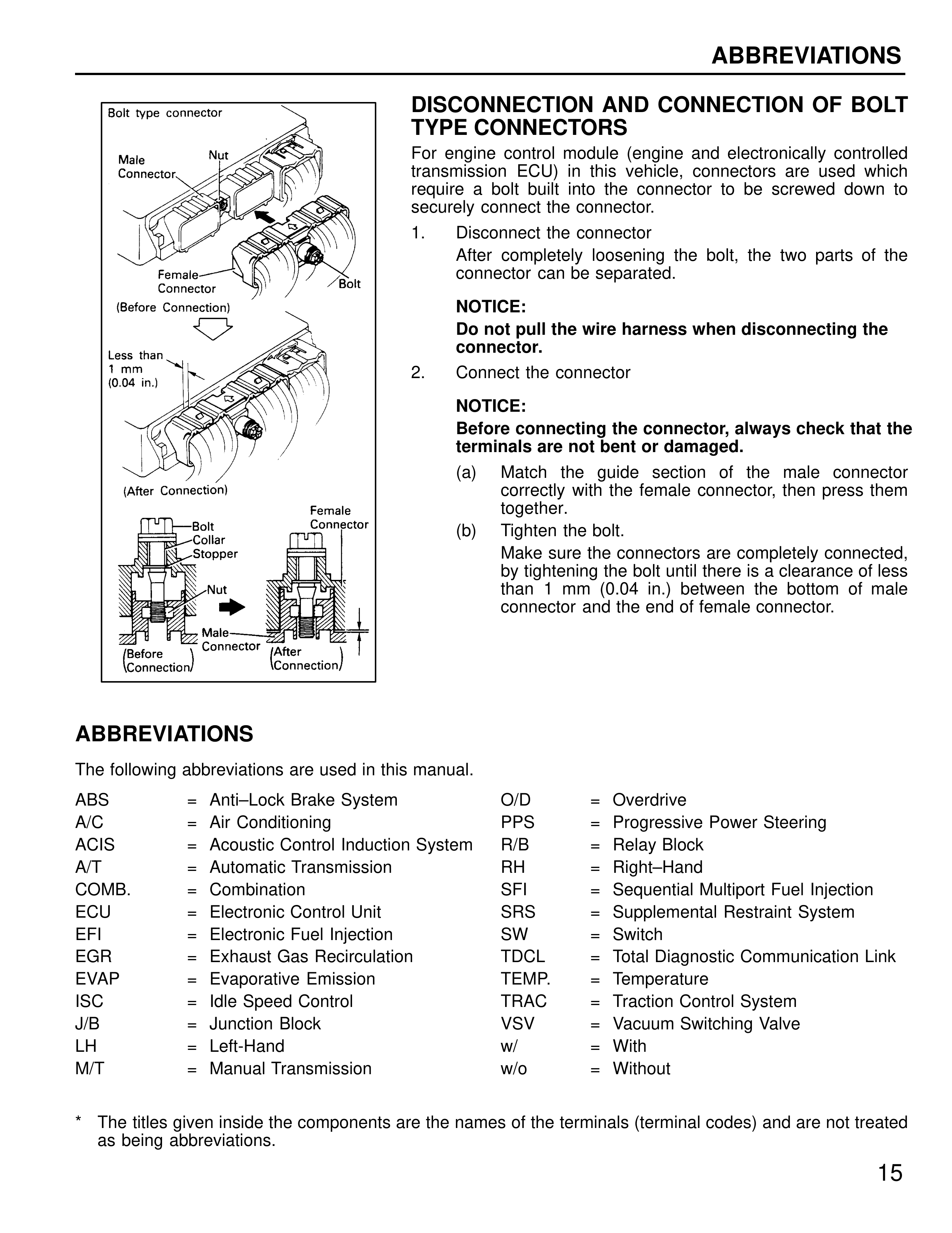 For engine control module (engine and electronically controlled transmission ECU) in this vehicle, connectors are used which require a bolt built into the connector to be screwed down to securely connect the connector.