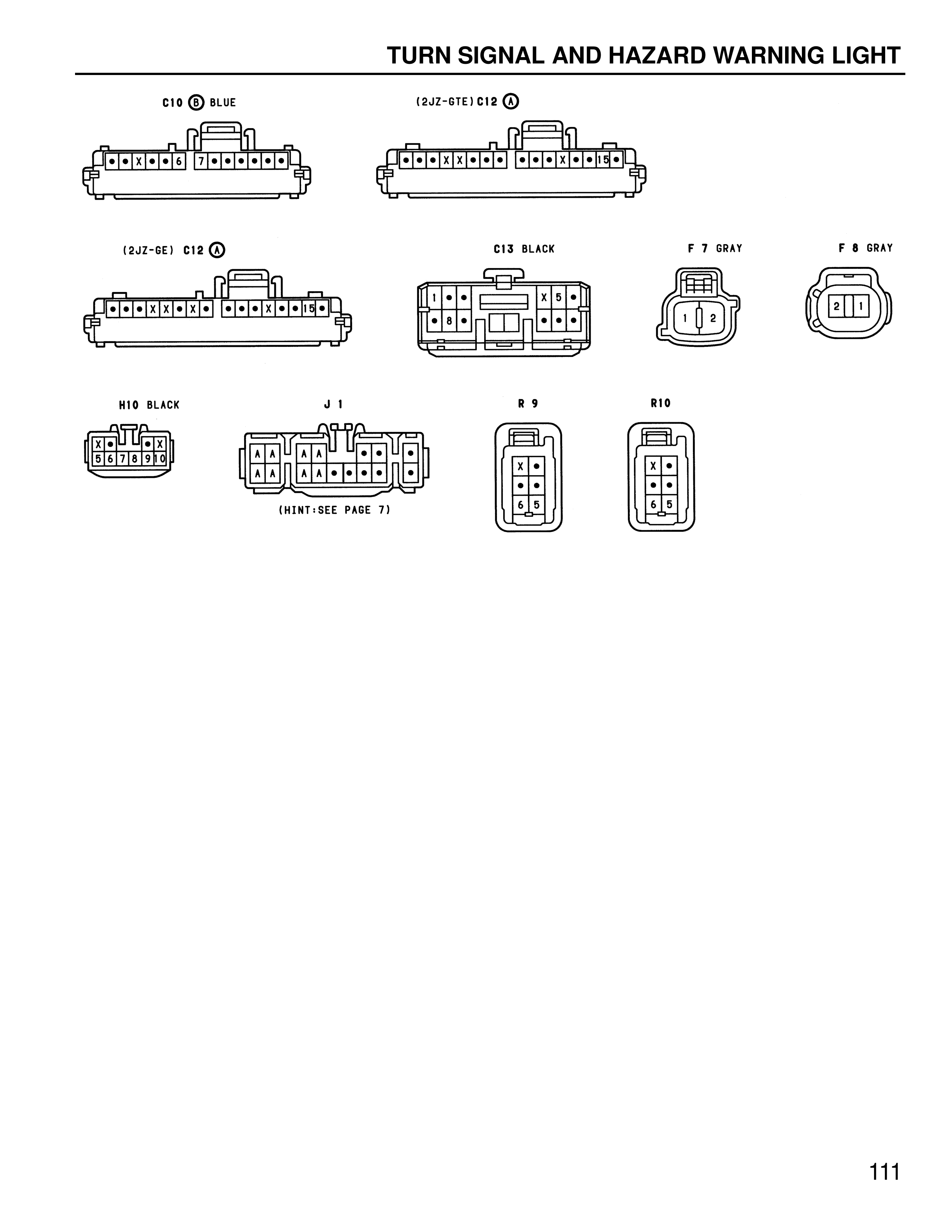 TURN SIGNAL AND HAZARD WARNING LIGHT C10 6 BLUE (2JZ-GTE) C12 X (2JZ-GE) C12 D C13 BLACK F 7 GRAY F 8 GRAY H10 BLACK J 1 R 9 R10 (HINT:SEE PAGE 7) 111